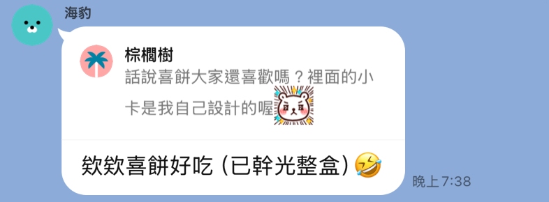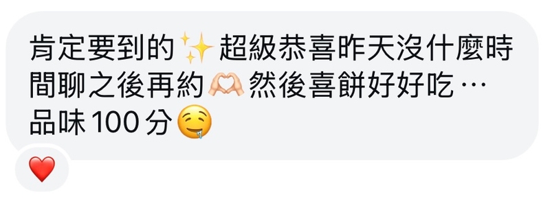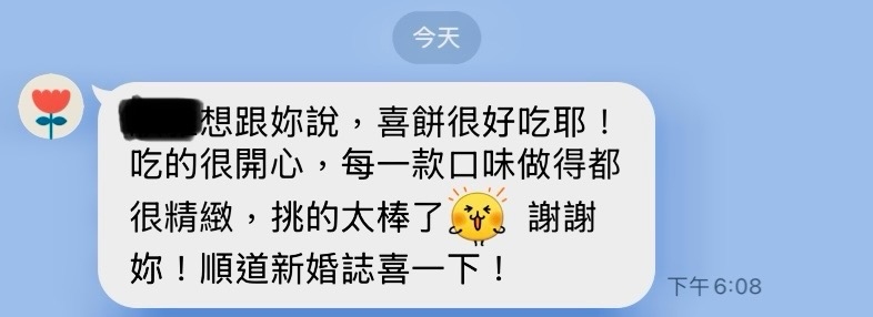 除了喜餅口味很棒之外,服務也很細緻!下訂後兩天馬上就成立了專屬Line群組,有任何問題為我們服務的Jack 及Elly都會很迅速的回覆訊息讓我們感到很安心!就連後來我想要自己設計喜餅卡樣式,他們也都細心告知我尺寸跟需要的格式協助我跟廠商溝通,印出來效果很好我自己超喜歡🥰