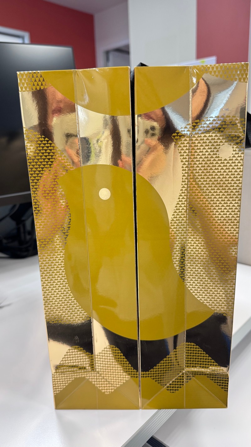 提袋跟盒子的包裝也很漂亮有小巧思,盒子側邊的兩個諧音祝福語貼紙很可愛!金色提袋手提部分刻意加長讓賓客可以直接上肩用背的真的很方便貼心,如果兩個擺在一起的時候側面還可以拼成一隻招牌小鳥真的很可愛!整體搭配起來很大氣!