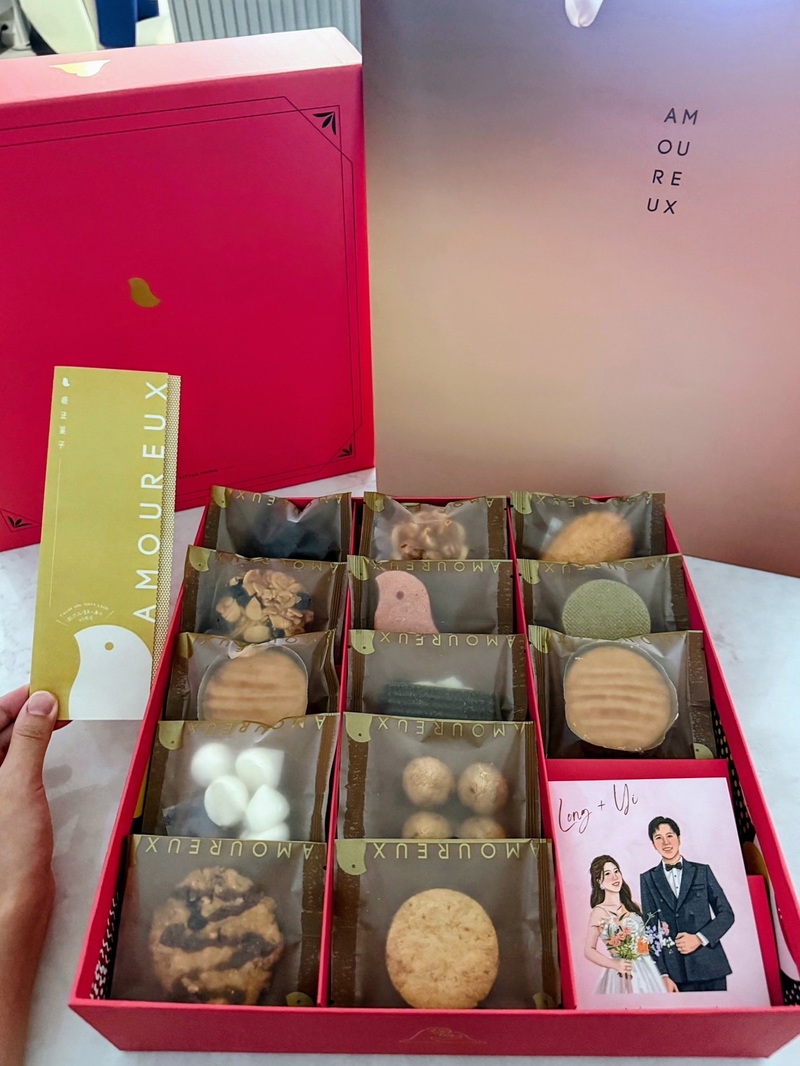 跑了好幾家台中喜餅店試吃,暖法菓子的甜點真的讓我們一吃就愛上!他們的艾許金沙卡雷特酥脆可口,奶香跟焦糖的微苦搭得剛剛好;海鹽巧克力餅乾有點鹹香又濃郁可可味,吃完還想再要一個;瑪德蓮軟軟的,帶點檸檬清香,烤過之後更香口感更好。這些甜點香氣超迷人又不死甜,吃起來完全沒負擔,試吃那天我們就決定選暖法菓子當婚禮喜餅!