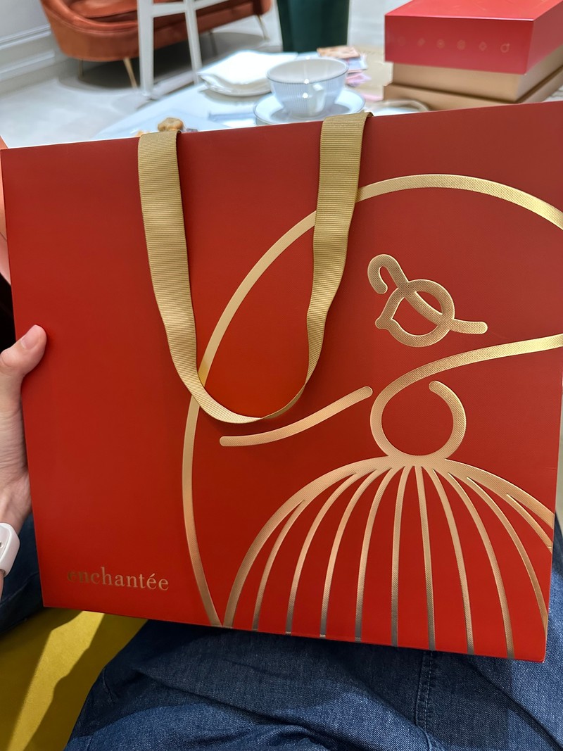喜餅禮盒的袋子有兩款可以選擇,一款是古銅金的,一款是高級訂製款(紅色的),從店員那邊得知高級訂製款是新款,且由於高級訂製款袋子上有可愛的Logo圖案,超級喜歡,所以後來就選擇了高級訂製款。