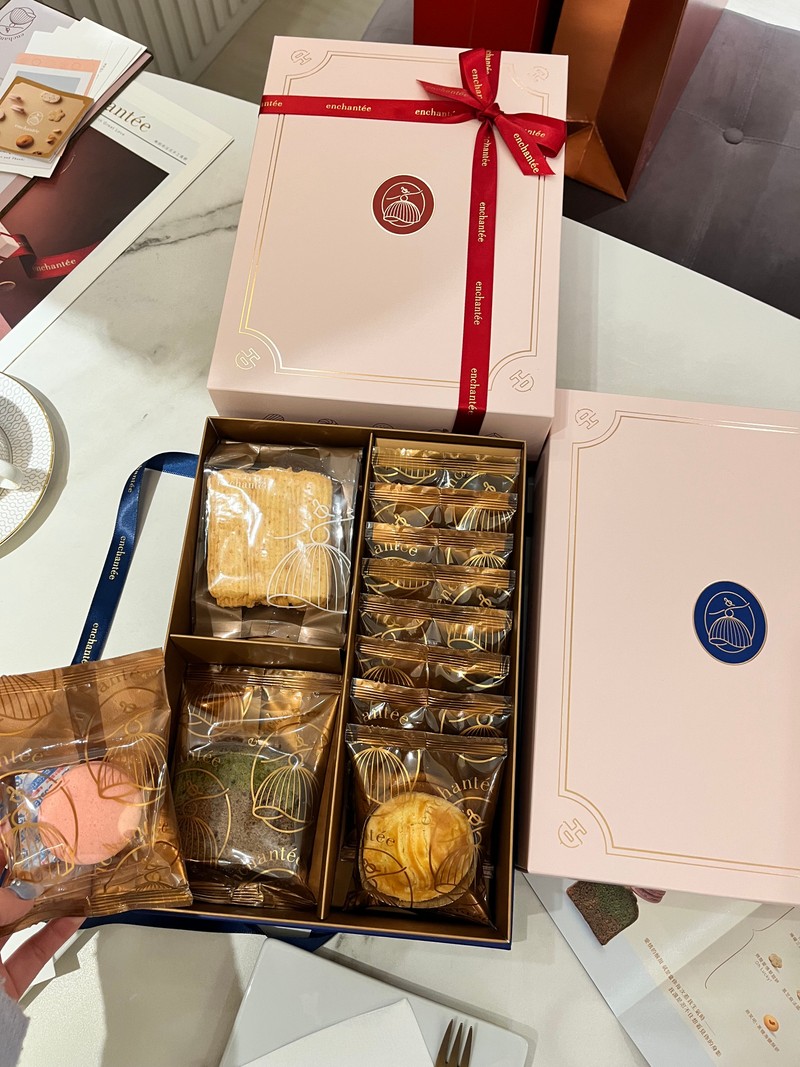 挑完餅乾後接著看禮盒款式,也是很難做抉擇,有雙層、單層,包裝或是緞帶顏色也都很好看,讓人更難選擇了,但很好的是跟餅乾款式一樣,都可以先暫定,回家與家人討論後再做決定。