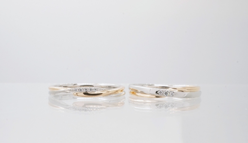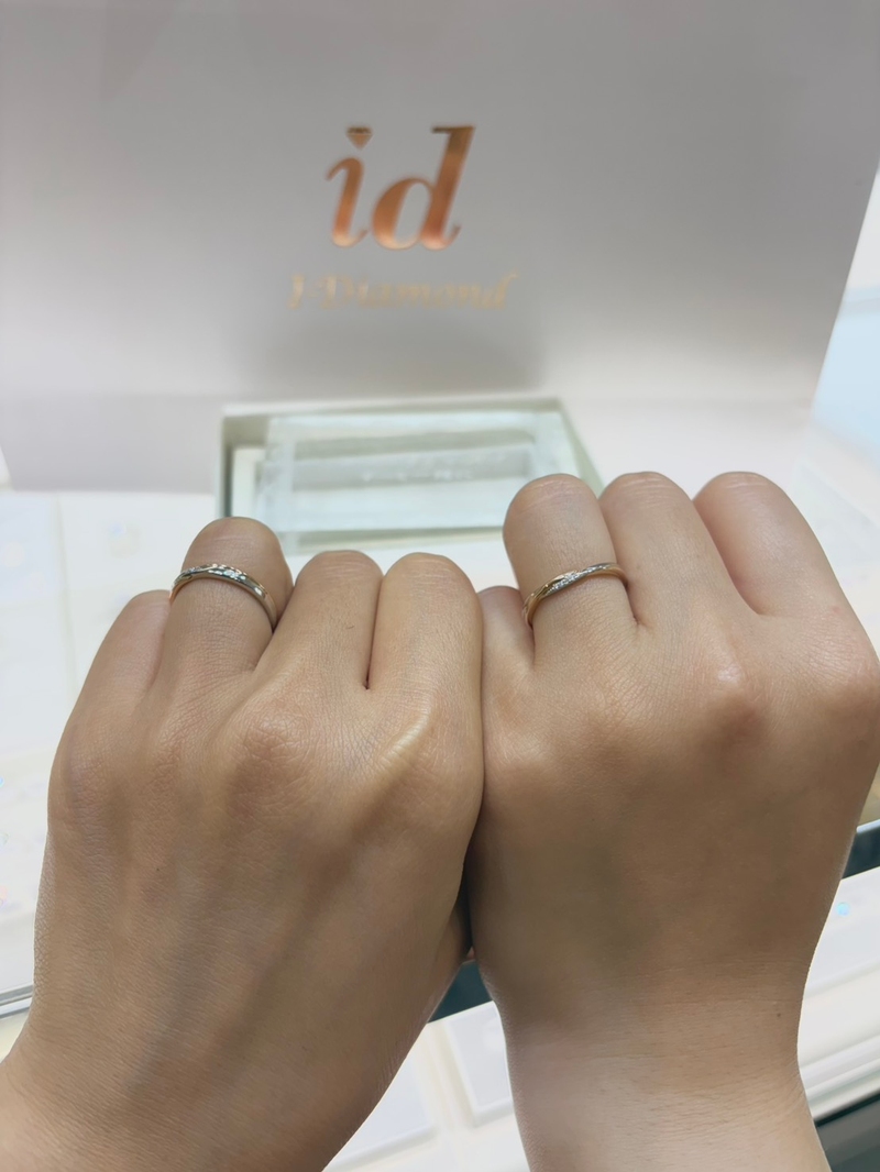 I-Diamond客製化的選項很多,我們挑了雙色亮面戒指,配上碎鑽看起來很閃亮,顏色則是玫瑰金和鉑金;我們都很喜歡「雙子星鑽石」這個概念,所以在戒指內有秘鑲石,是在對戒中鑲嵌由同一顆鑽石原石切割出來的小鑽,也刻上彼此的名字