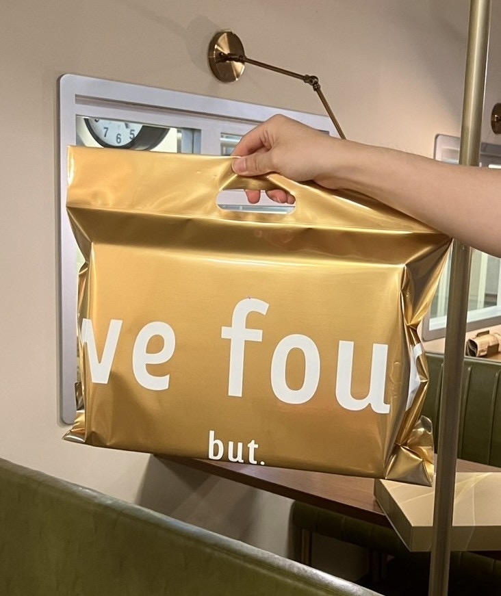 而且提袋也超美!不是常見有繩子的提袋,是做金色搭配英文字母logo的手拿設計,走路提著都覺得自己很氣質哈哈哈,連我爸媽看到都說水水水好看!