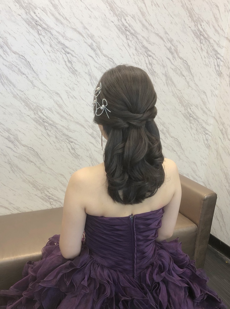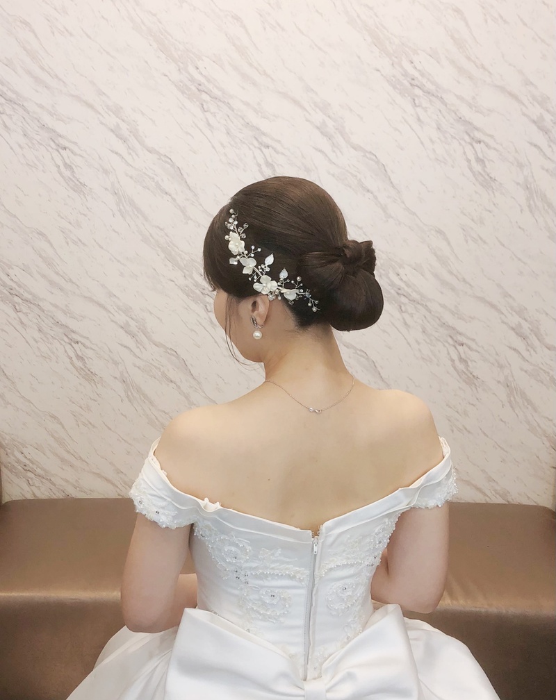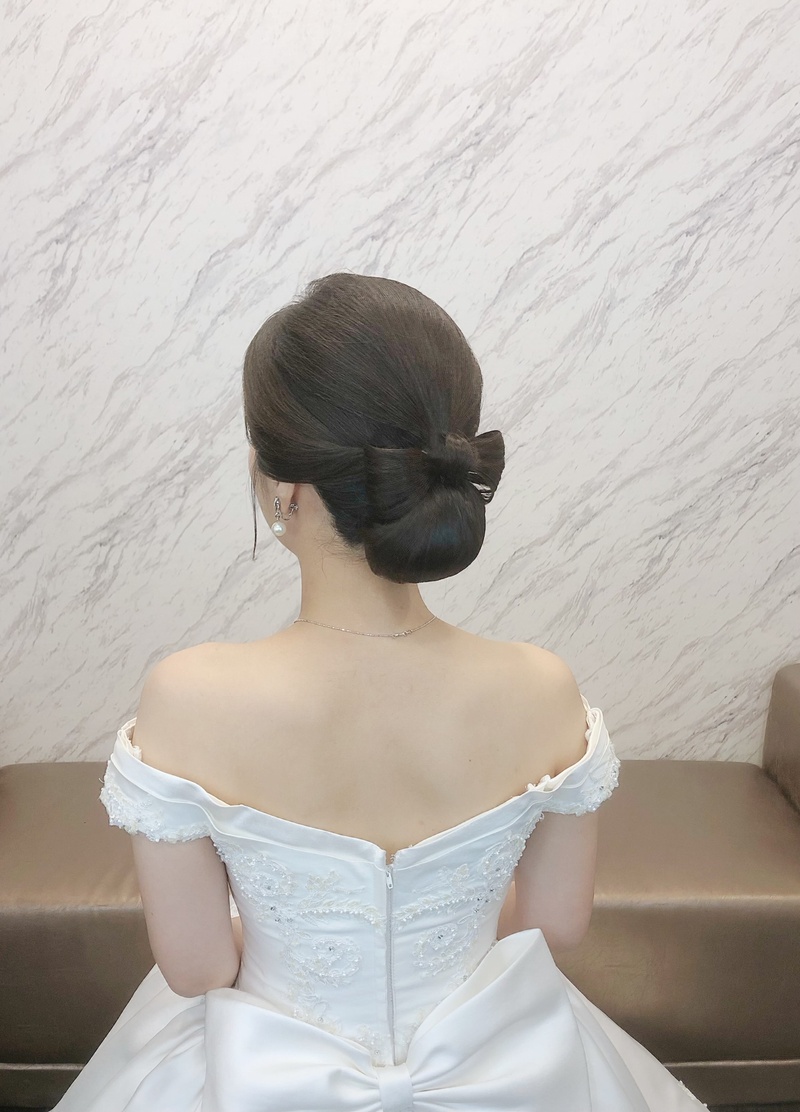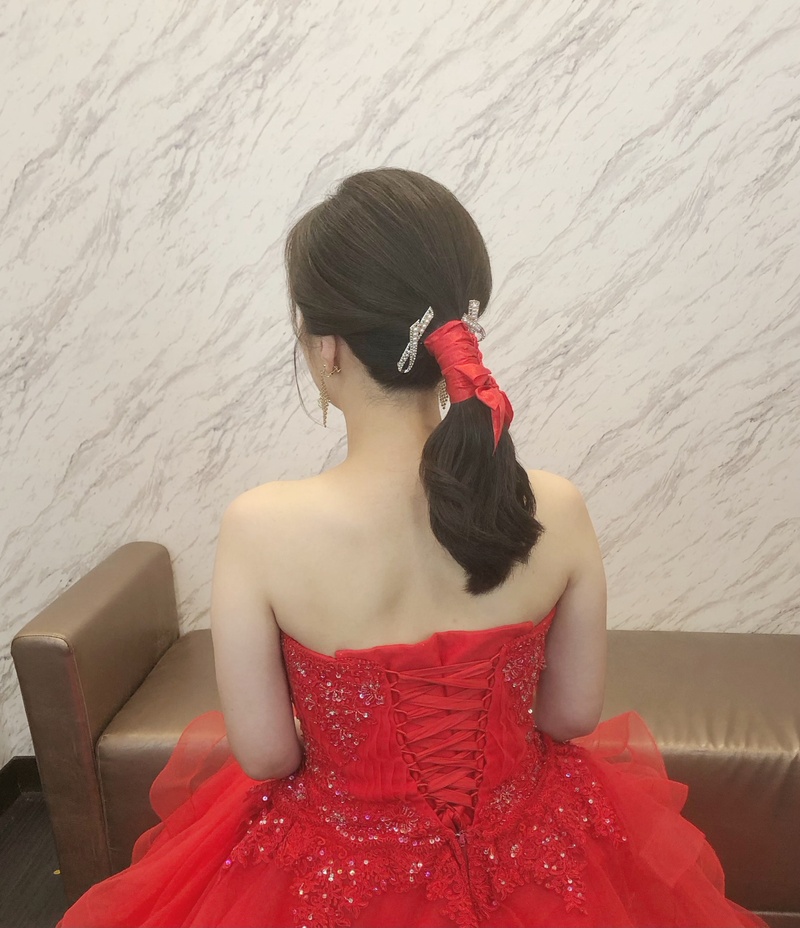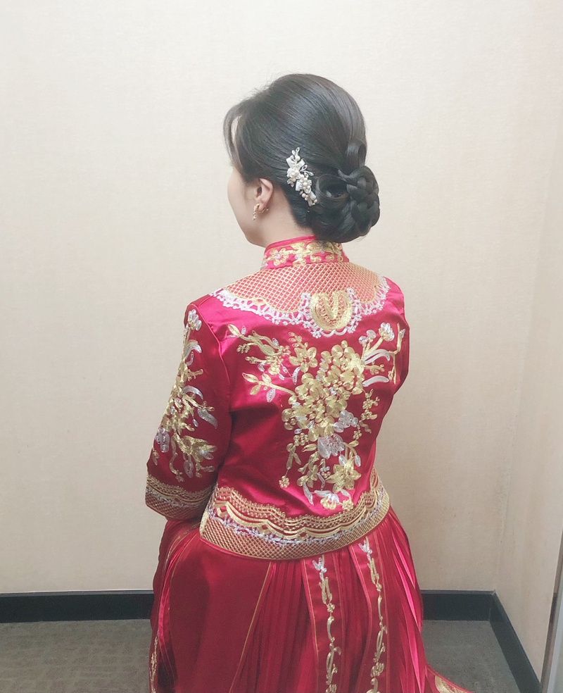 婚禮當天共有四個造型(文定、白紗、敬酒、送客),風格簡約大方,我比較不偏愛太華麗的造型,而老師用輕輕點綴就讓我看起來很有氣質,耳環也搭配得很好看。文定儀式的盤髮很驚喜,是一種象徵好寓意的「同心結」造型,之前在網路上都沒看過,我第一次見到!