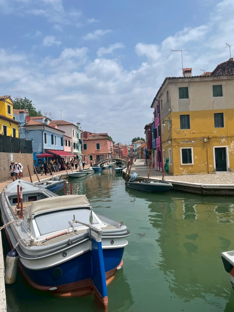 威尼斯的彩虹島在五顏六色的建築中逛著裡面的小市集