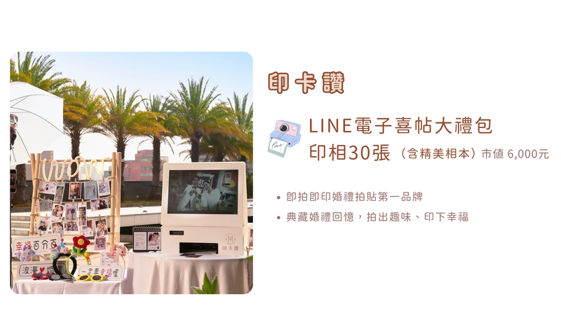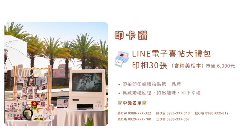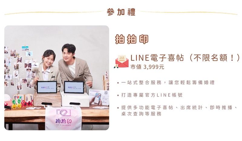 凡是在大賞期間〖預約試吃〗任何一家喜餅,即可獲得價值近$4,000「拍拍印-LINE電子喜帖」!!