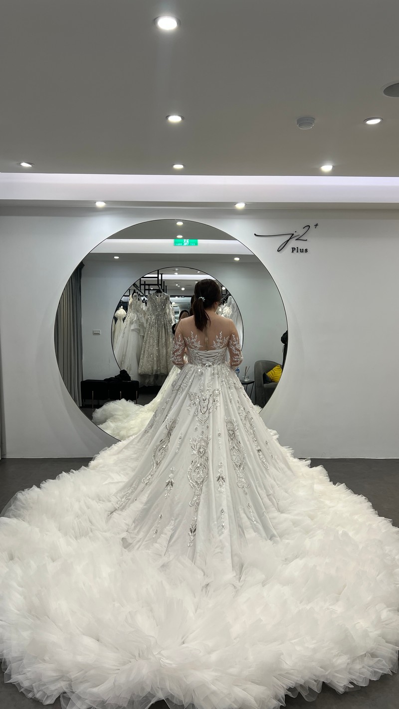 我的婚期是在明年的一月,是在今年六月才決定的,問過身邊已婚朋友才知道其實時間有點趕,J2是我從網路上自己搜尋找到的,門市諮詢是第一家,原本想再多諮詢幾家做比較,但Una的介紹跟試穿體驗讓我直接下訂了J2。