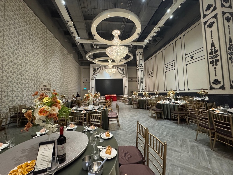 第一次去彭園就被挑高的設計所吸引,我非常喜歡這個挑高的設計,這是一般婚宴會館比較少見的,不會讓人有種壓迫感,廳房風格都也很多元,搭配水晶吊燈,每個廳房都很有特色,我最喜歡A廳教堂風😍 但礙於桌數太多只能放棄A廳,我們這次是訂最大廳G廳(圖片是G廳)