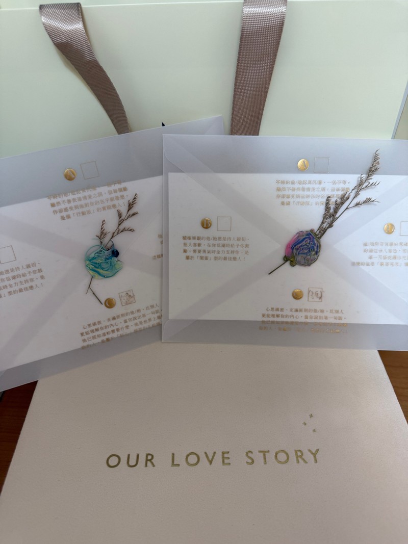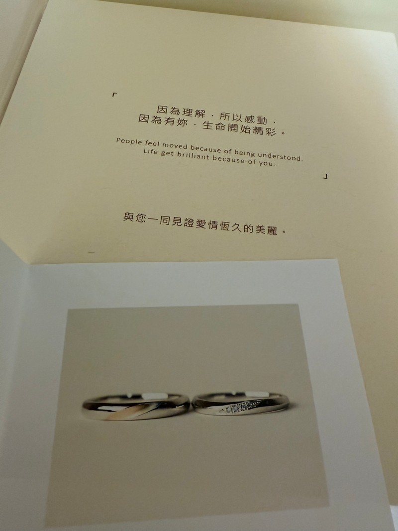 店員的服務也令人印象深刻,不僅細心介紹每款戒指的設計細節,還分享了老闆以電影《天外奇蹟》🎈的故事為靈感,希望每對戒指都能象徵伴侶間的陪伴與承諾,讓每對新人都能攜手創造屬於自己的獨特回憶。挑選的過程中,店員也始終保有耐心,引導我們多試幾次不同的款式,整個過程大約花了一個多小時來進行。