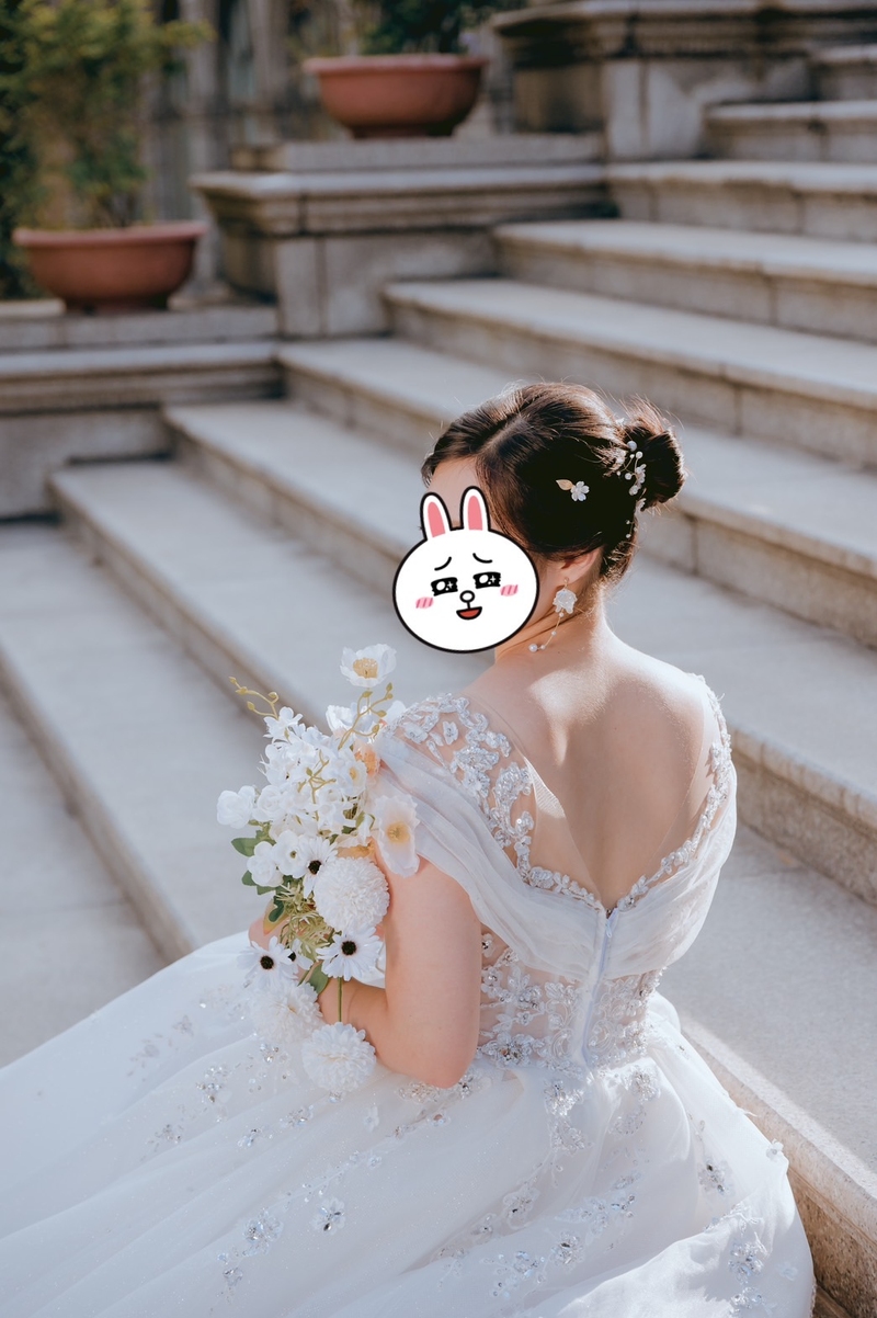 這套白紗超美,頭髮造型更美,可惜回去才發現沒有拍到髮型背後的樣子😭靜儀老師真的非常會搭配,飾品跟白紗配的天衣無縫😭
