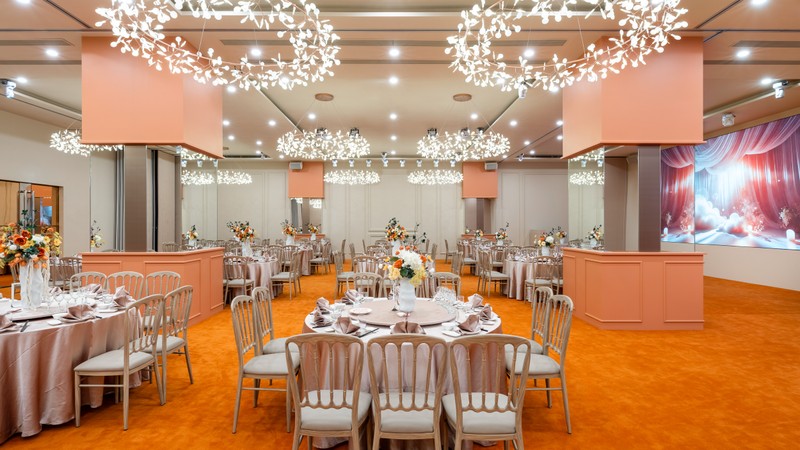 A廳宴會廳風格以暖橘色系為主,當天我們舉辦了19桌,有兩個大投螢幕+一個柱子附有小螢幕,在新人進場或活動表演時,彭園也會即時LIVE轉播,不太需要擔心賓客會有死角或是離走道很遠導致看不到新人問題。