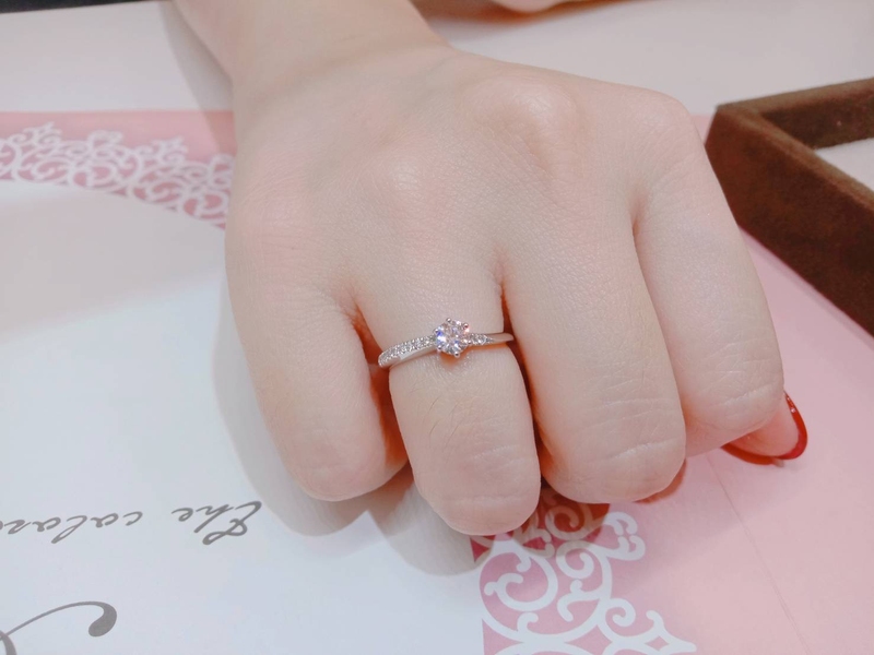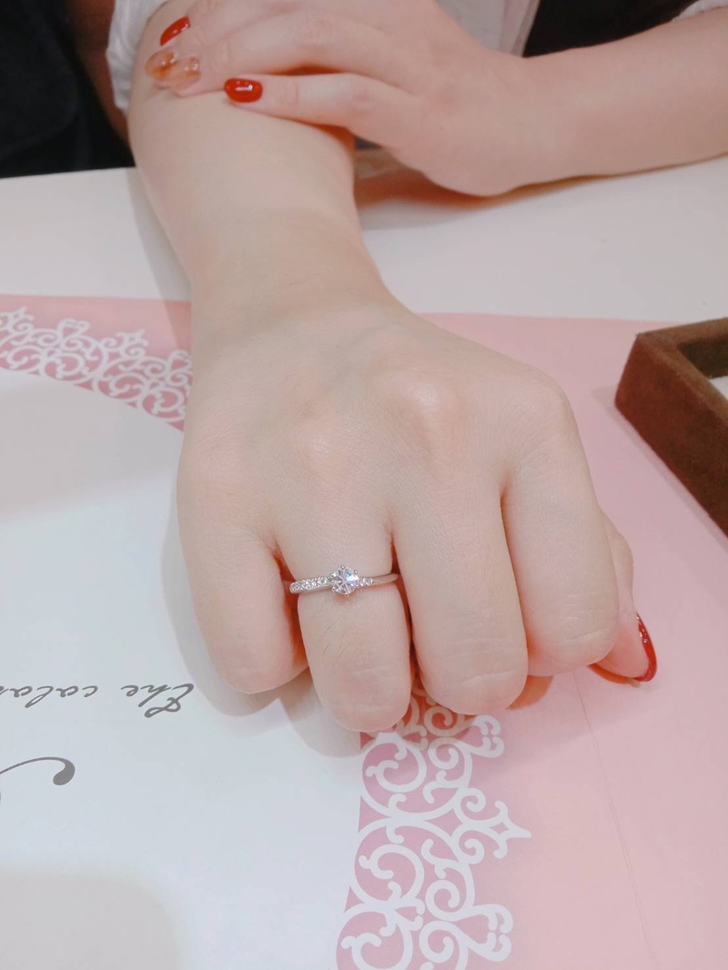 女友在聊天過程後知道有”先借再買”的方案表示非常新鮮,我們之後回到門市找店員,開始讓非常有想法和有自我喜愛風格的女友自己挑選喜歡的鑽戒,同時謝謝店員依舊耐心地協助我們一一挑選和試戴,還幫我們拍很多試戴側寫,最後C.C. 選了很適合她的經典六爪鑽戒,非常簡約大方elegance!