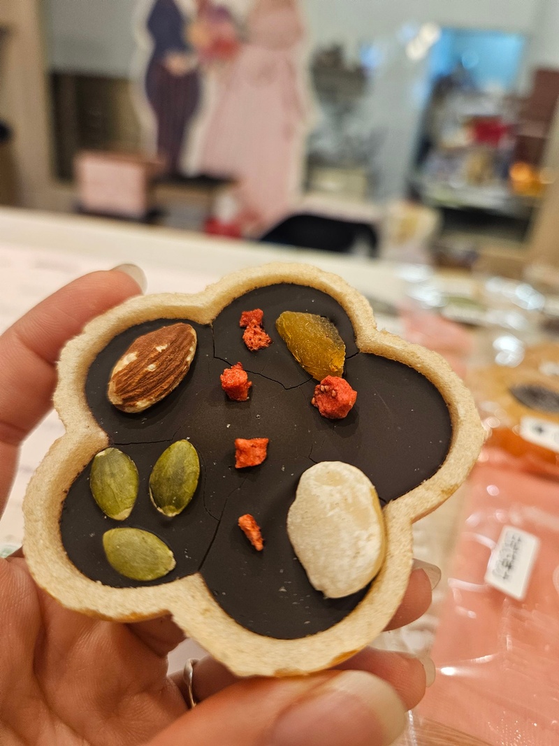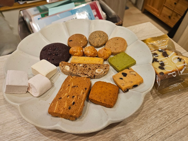 再來是他們家的餅乾都是純手工製作,成分天然單純無負擔不含防腐劑,連吃了二十多種餅乾也完全不會膩,除了經典常見的餅乾好吃,更是有許多特別令人印象深刻的餅乾,例如抹茶橙香,第一次知道抹茶可以搭配橙皮,抹茶的香氣配上橙皮很有層次很特別;甘梅地瓜,淡淡的地瓜香,不甜膩,搭配梅粉脆口好吃;楓糖胡桃,楓糖香氣很足,以楓糖來說也不會太甜;薰衣草巧克力,薰衣草香氣爆擊,配合白巧克力以及奶味,將薰衣草完美的融合在餅乾中;醇脆熊可可,可愛的熊熊造型,小麥脆粒增加了口感,很好吃的一款巧克力餅乾;義大利脆餅,喜餅少見的選項,咖啡香氣,硬脆的口感很酥香;堅果塔,完整的酥脆塔皮與一顆一顆裹蜂蜜糖漿的堅果,完全可以媲美專門堅果塔店的商品,很有競爭力;另外小鐵盒內的榛果巧克力,酥鬆的曲奇配上中間的巧克力醬,意外的不甜膩,令人印象深刻。