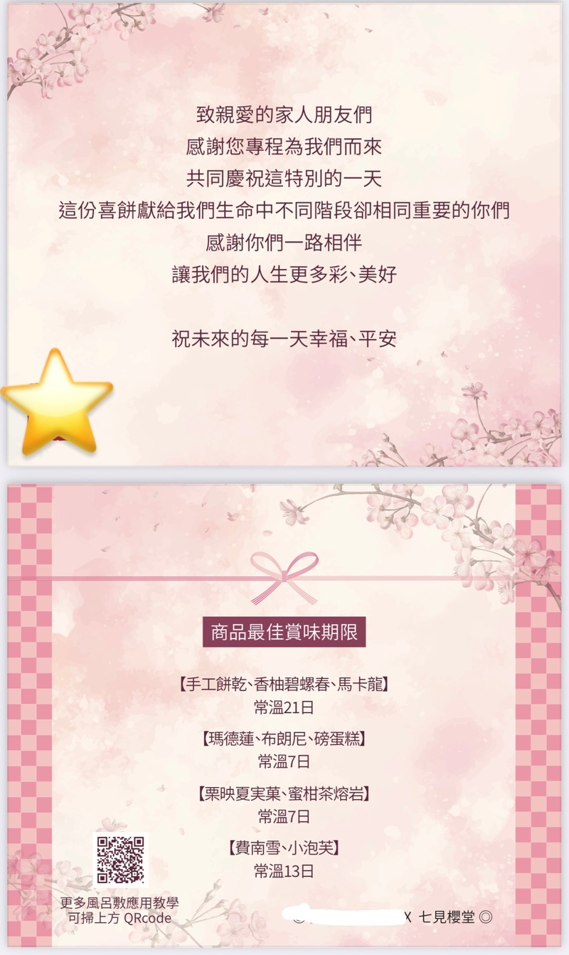 確定完婚期後就馬上開始找喜餅了,原本已經付了一家的訂金,後來看到七見櫻堂,感覺很好吃XD,想說試吃一下也不虧(本人超級愛吃餅乾),結果吃完馬上跳槽!!當下就付了七見櫻堂的訂金,因為真的太好吃!!日式包裝非常有質感,而且餅乾的口味超級多,每個都是好吃的,像在吃日本精緻餅乾禮盒,拿來當喜餅超級有品味啊!!