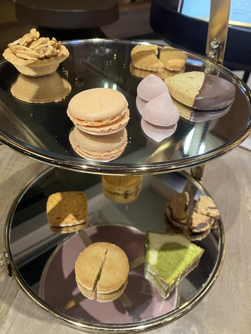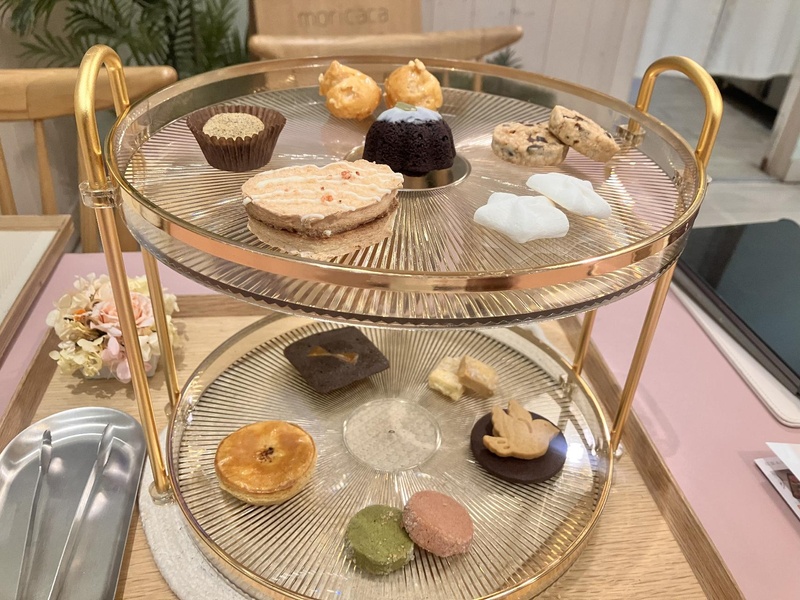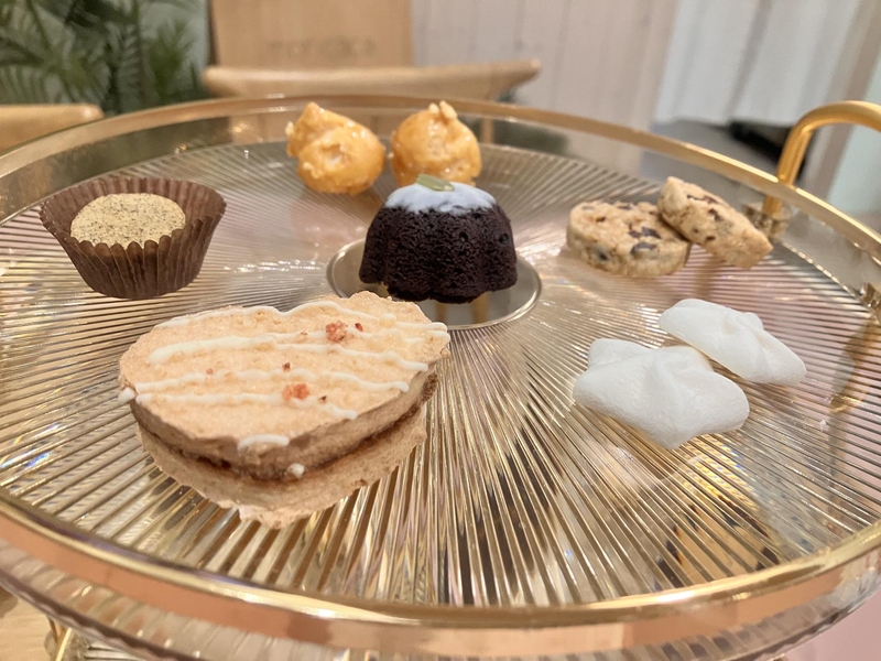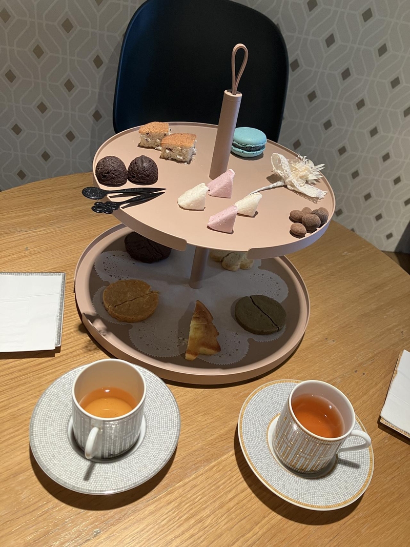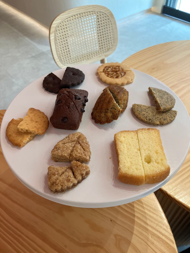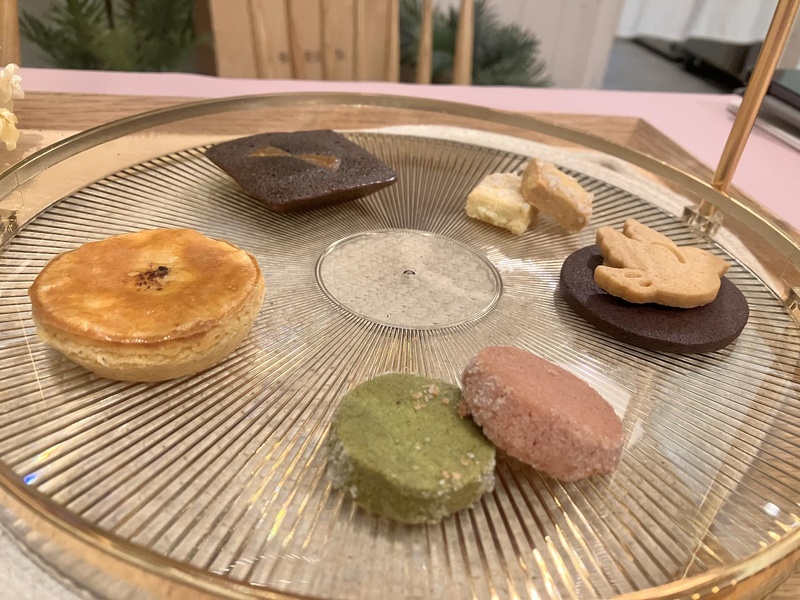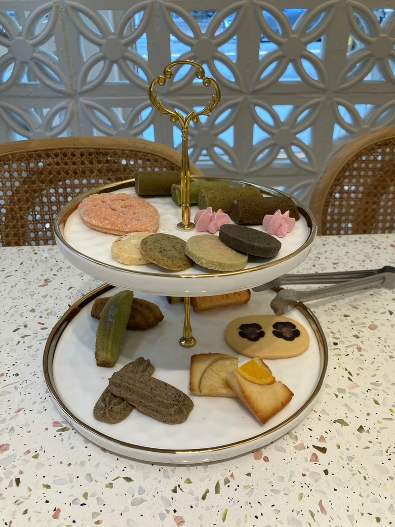 這間店強烈推薦所有人都去吃看看欸!儀式感滿滿從頭驚嘆到尾,整場體驗下來整整兩個小時過去都沒發現,十分精彩有趣!台中店是飯店概念的設計,門口就漂亮到差點不敢踏進去,一進門服務人員遞上有兩人姓名首字母的鑰匙說要帶我們去check in時還覺得微尬,但踏入店內好多樓梯層層疊疊充滿設計感的空間就開始覺得奇幻了起來,像是到飯店lobby享受一場下午茶一樣。平時我沒有特別喜歡紅色,但在這邊挑到了喜歡的紅金搭配的禮盒,很繽紛又很喜氣喔。整體的餅乾只能給一個評價:奶油香氣太厲害了!滿滿的奶香簡直像是吃到奶油本人,但吃完十幾個品項之後還不會覺得膩口,搭配上現場的裝潢及服務差點當場就要說yes I do,就這麼魔幻。最喜歡的餅乾是布列塔尼鹽之花酥餅:鬆脆的餅乾吸飽了奶油,完全凸顯出奶油的香氣,微微帶點海鹽的鹹讓餅乾的甜味更輕盈,吃完直接問能不能買一盒回家吃,可惜這邊的餅乾都沒有單賣的,想吃只能下定了;親愛的伯爵茶餅乾:半片的餅乾沾了巧克力,微酸帶有花香的巧克力和伯爵茶的佛手柑味道超級搭!一片餅乾可以吃到兩種風味,印象非常深刻;抹茶鹽之花蛋糕:一般吃到的海鹽點心都是微微帶有一點鹹味的甜點,這款蛋糕海鹽的部分沒有在客氣真的是鹹的!和抹茶的部分咬在一起帶出很日式的鹹甜味,是很平衡的濕潤好吃的蛋糕,這間的磅;蛋糕作成房子的造型,每一款的配色都很可愛喔;仕女茉莉茶餅乾:茉莉的花香很輕盈,但餅乾的基底仍是滿滿的奶油香,是一款吃到濃濃的奶油味的同時還會覺得很清爽的神奇餅乾。