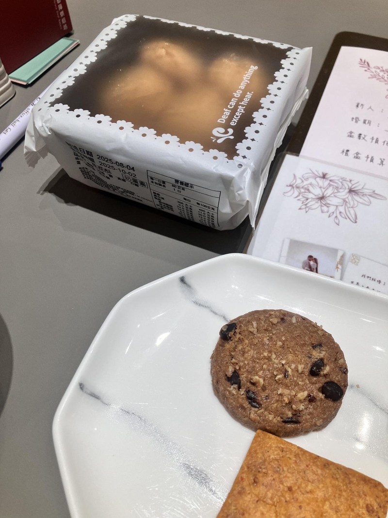 朋友推薦去看的喜餅,夾心餅乾都非常優秀,手工餅乾口味也都很有特色,是跟其他喜餅店風格很不一樣的店家。當天除了現場試吃還給了一個小試吃盒帶回家和家人一起品嚐非常貼心。原本做甜點起家,因為客人訂購後才慢慢轉型做喜餅,包裝較為手工一點。禮盒組成很有彈性,我整個放好放滿所以價錢算起來有點高。所有的夾心餅乾我都非常喜歡,尤其是造型可愛的巧克力夾心木木,巧克力的味道很濃郁,微酸帶有一點果香非常驚艷;抹茶餅乾:很大人味的餅乾,苦味的餅乾外面還果一層抹茶粉末,喜歡抹茶的人真的會超愛;仙草餅乾:吃起來完全像固體燒仙草!仙草味超重,綴有一些花生顆粒真的很像燒仙草,是我會想單買一罐回家吃的餅乾;楓糖燕麥餅乾:裡面有加一點椰子絲,口感及層次都很鮮明的好吃的餅乾。