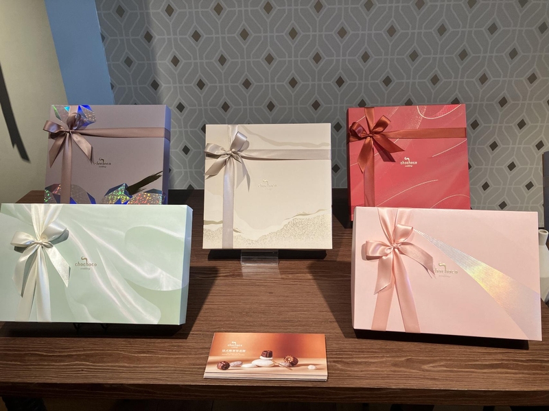 因為近期收過朋友這家的喜餅,在開始看喜餅前已經覺得這間贏面很大所以放在最後一天,這間主打巧克力,現場也有賣好吃的生巧克力和布朗尼喔,看完之後直接帶了一盒回家吃。禮盒的配色都很溫柔,現場看會發現有一些閃亮的燙金或反光,覺得比看照片還更漂亮喔!好吃的部分不用說,就是巧克力!我都想選一整盒全部都是巧克力的禮盒了~最喜歡的是現場也有販售的經典巧克力布朗尼:做成一口大小的小球超可愛,巧克力的比例高到用嘴巴輕輕一壓像是吃到整顆固體巧克力一樣,香氣的部分更是不用說,濃郁但不會覺得苦,要不是買了生巧克力的話也想帶一罐回家吃;費南雪古典蛋糕:偏薄的蛋糕體中間放了一層巧克力醬,濕潤的杏仁蛋糕加上中間的香檳可可超級搭的,會想重複選兩塊的厲害蛋糕;黑芝麻白巧克力馬卡龍:藍色的外殼超美的!芝麻內餡香氣濃郁像是吃到好吃的之湯圓,超級甜但吃完還會想再吃一顆。這家稍微遺憾的部分是有固定的必選餅乾我比較吃不懂,茶香不明顯但充滿奶香的茶餅乾以及沒吃到但介紹主打伯爵茶香的巧克力餅乾讓我有點困惑,扣掉必選的部分能挑選的餅乾數量就比叫受限。