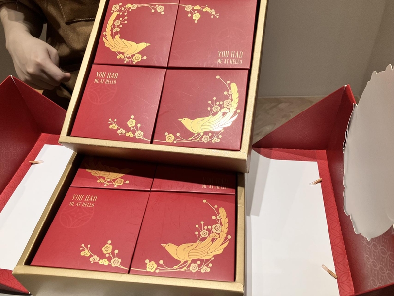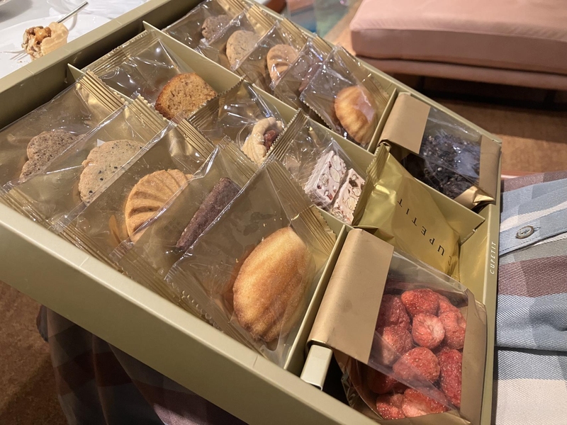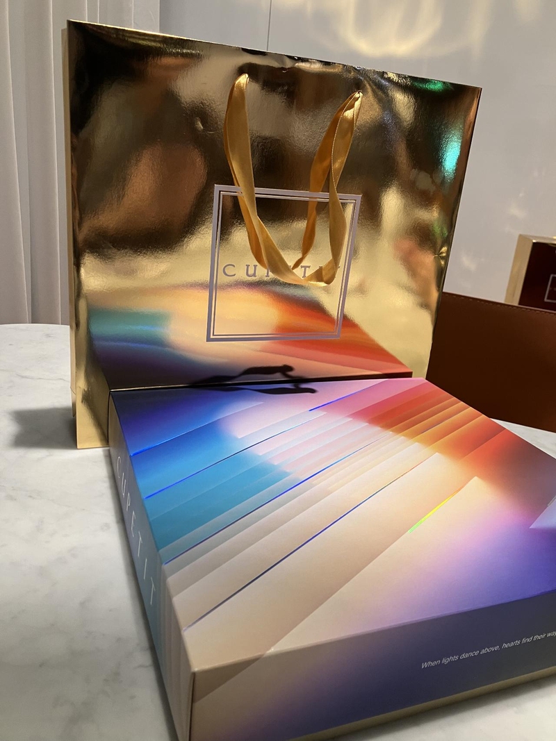 Cupetit大概是我在fb看到最多廣告的一間了,一踏進門第一個感想就是金!光!閃!閃!提袋整個閃亮亮不說,每個盒子都有燙金的設計,超級閃亮的。因為很喜歡極光的盒子款式,那款禮盒為固定內容不能客製化,就直接試吃了這盒的品項,整體偏不甜但香氣仍然十分明顯。DM上直接標示了甜度等級,滿貼心的設計。折扣很有誠意但是後續還有要試吃的店家就無緣錯過了。比較有印象的品項是:英式伯爵茶餅:茶香非常細膩濃郁,甜度是三顆星但我覺得沒有非常甜,感覺是接受度很高的餅乾;焦糖無花果磅蛋糕:咬到無花果的種子的口感很有趣,第一次吃到無花果口味的喜餅很驚艷,焦糖的香氣很棒;核桃黑巧克力:厚實又不會太硬的餅乾,咀嚼感很棒,是苦甜的巧克力。