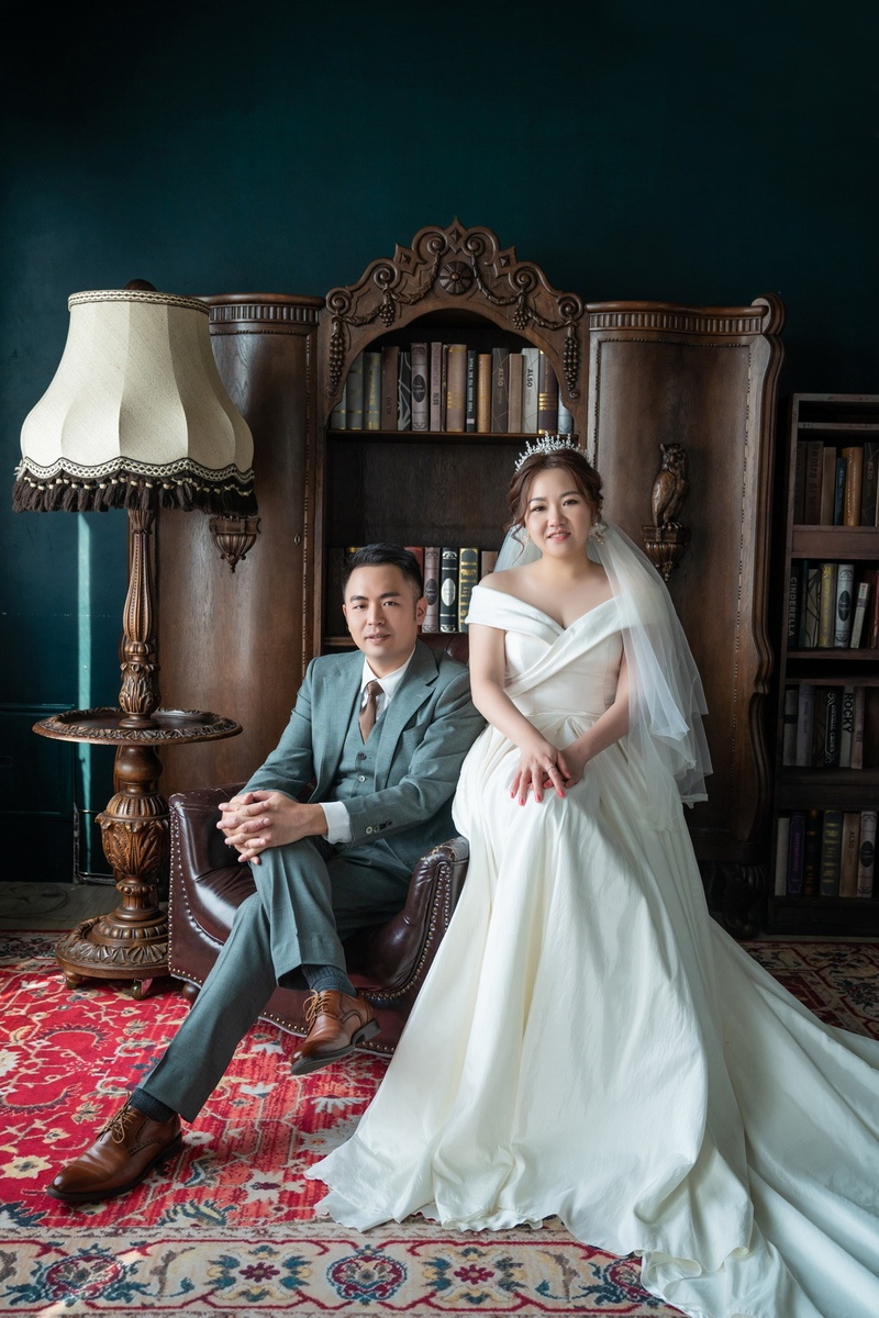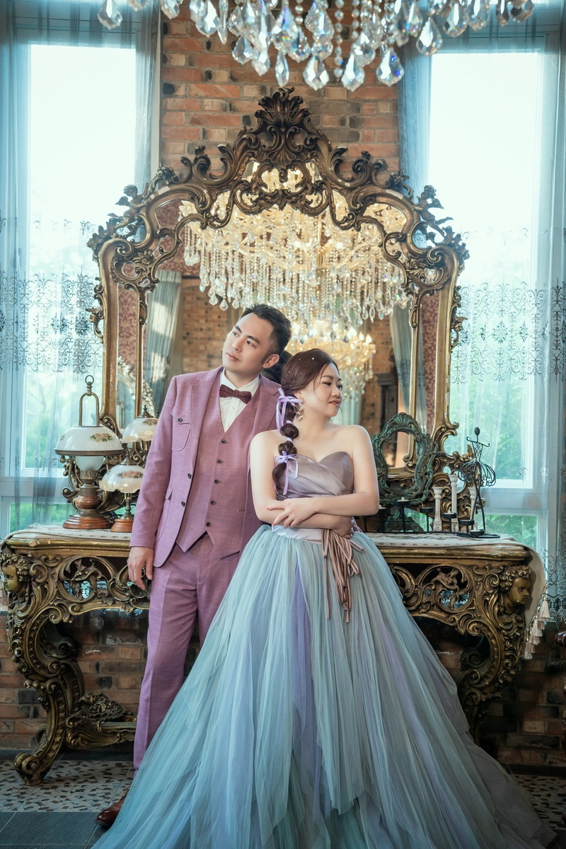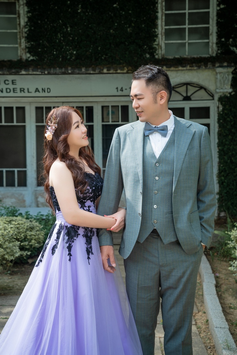 終於來到了拍照的日子,一早還沒八點就來到婚紗公司,造型師妍芯已在化妝間等待著我們,並且迅速充份展現出專業技能,把我們上完妝髮,就在攝影師劉sir的呼叫:「該出發囉」,我們就上車前往我們的目的地:「愛麗絲基地」,到了以後,劉sir 依照先前所討論的風格與想要的感覺,在劉sir的專業領導與指引下,讓我們就馬上進入狀況,再加上燈光師緹薰的專業打光與走位指引,把我們黯淡的臉都照的容光煥發外,位置與服裝也都是一次到位,讓我們快速的完成整個拍照流程。