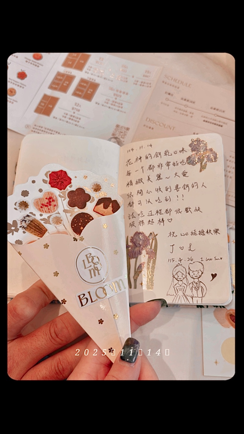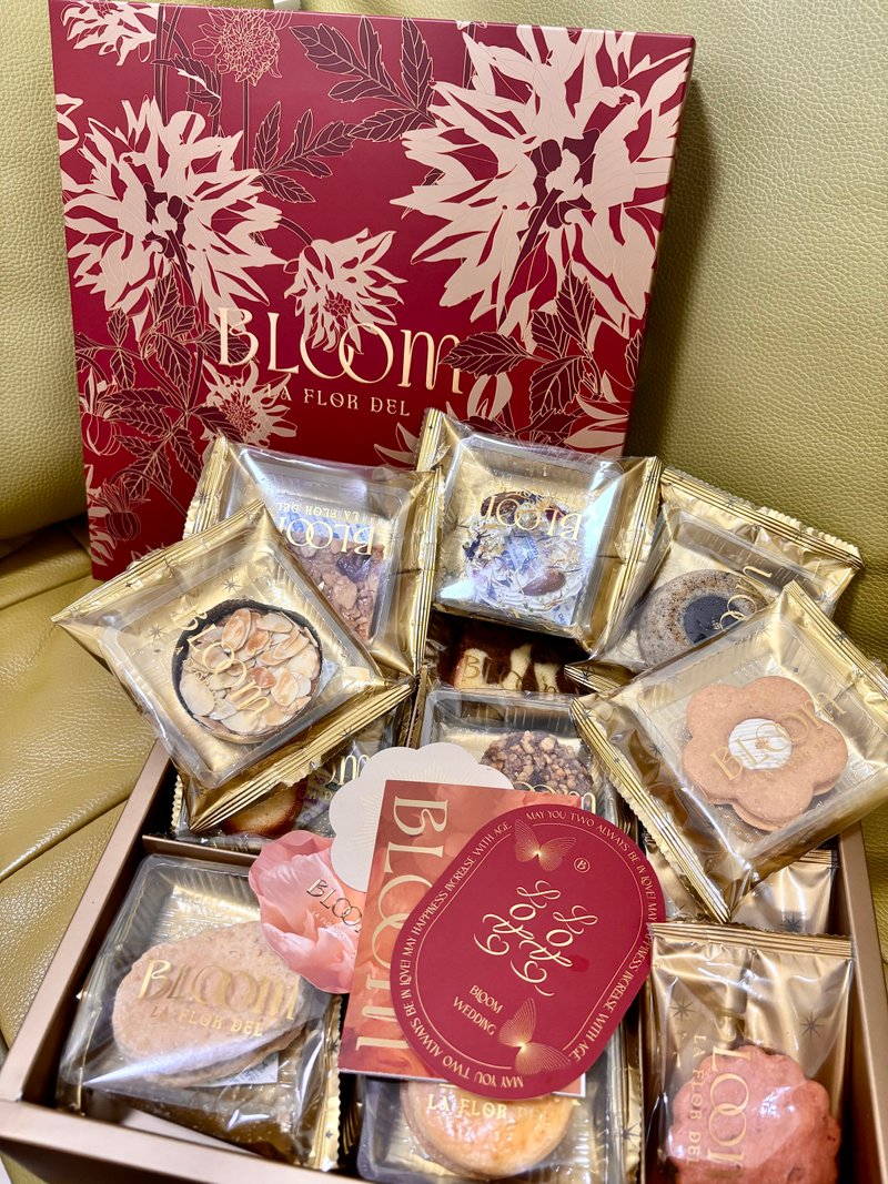千挑萬選!終於選到一間非常喜歡也很滿意的喜餅店!從一進去店裡,每一處都像是網美打卡圖一樣裝潢跟佈置都非常的夢幻浪漫,如果是新人可以提前預約試吃,經典口味都會一一介紹跟試吃,過程講解的非常仔細也會給一些意見服務態度一級棒👍,再來禮盒及提袋也都非常精美,有很多款式可以選,都可以挑到自己喜歡的,最後還有一個小本子裡面寫著每一對新人留下來的評論或是祝福,看著真的非常溫馨~還有小小製作環節,可以將自己喜歡的口味貼紙貼在捧花裡留作紀念,真的很貼心可愛🥰超級推薦每對新人來這間買~價格也很親民大愛❤️