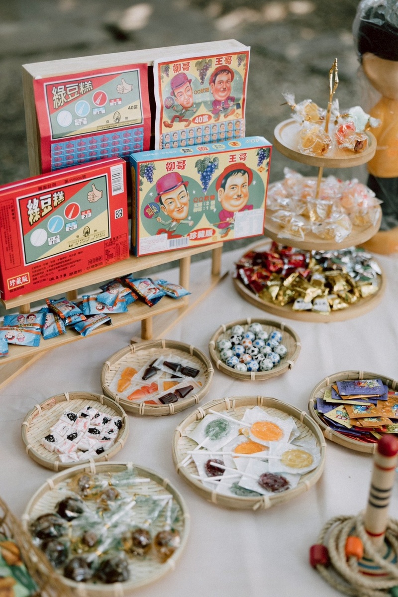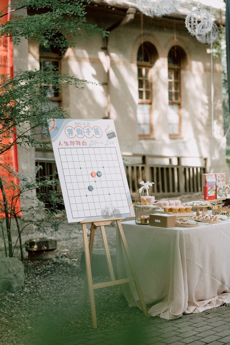 謝謝我的家人與朋友們,也感謝雷依一路以來的引導與支持,讓那一天成為如此美好而難忘的一天。當天到場的家人多為長輩,我們希望給予每一位來參與的人,不只是觀看一場婚禮,而是能共同參與、遊玩、聊天,真正走進我們的世界。於是,在設定婚禮主題時,我們想到了多數台灣人共同擁有的美好回憶——童年。以「春風雜貨店」為概念發想,結合我們最愛的舞台劇元素,創作出一場貼近日常、充滿復古氛圍的舞台劇婚禮。