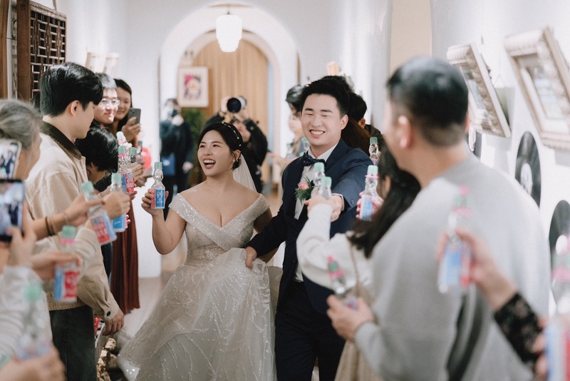 歡樂的氣氛延續在用餐的每一刻。想樂在每一個細節上都反覆與新人確認,因為每一個橋段,都是我們的愛。台灣孩子共同的記憶——彈珠汽水,搭配進場時機響起,讓人感動不已;我們生命中重要的人,與我們一起敲杯進場,那一刻的興奮與感動,至今仍深深留在心裡。