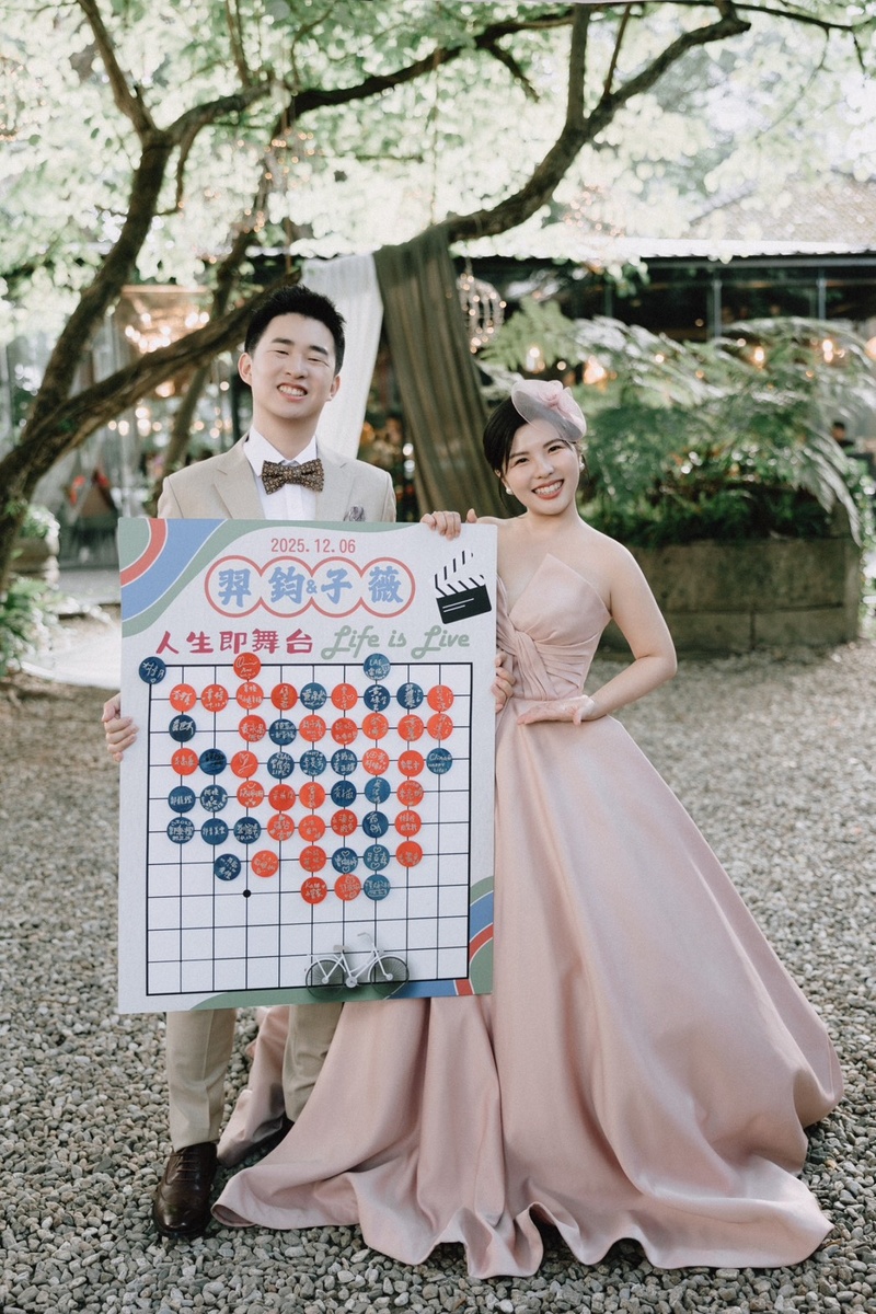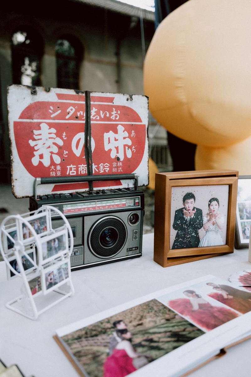 台灣經典的 LV 包包——茄芷袋,成為婚禮的主色調;熟悉的童玩、糖果餅乾、小時候的電話、收音機、結婚皮箱與黑膠唱片,搭配我們的生活照片,以及五子棋的簽到設計,一點一滴堆疊出只屬於我們的模樣。每一次的討論與調整,最終成就了那天最經典、最有溫度的佈置。