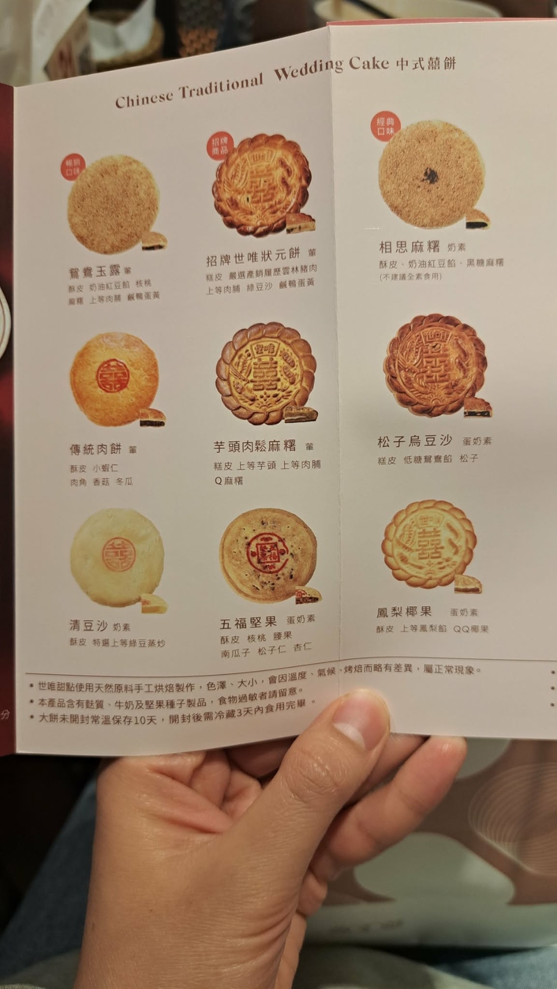 中式大餅的選擇有很多,老實說我和老公本身都不太愛吃大餅,所以這一塊一開始就交給長輩決定。爸媽原本已經選好北港的日興堂,直到有一次一起逛婚展,遇見了「世唯囍餅」,才改訂世唯。