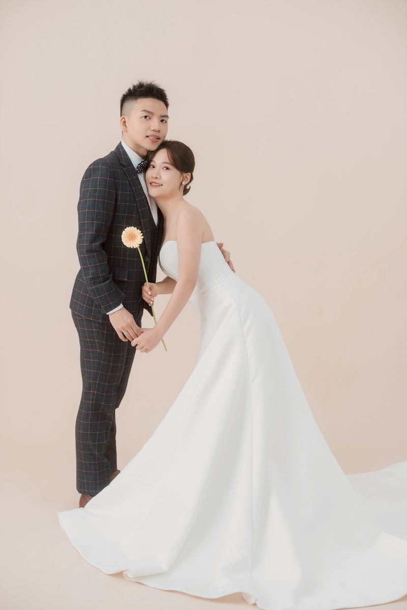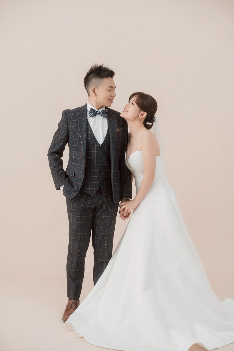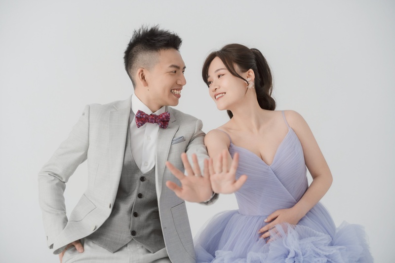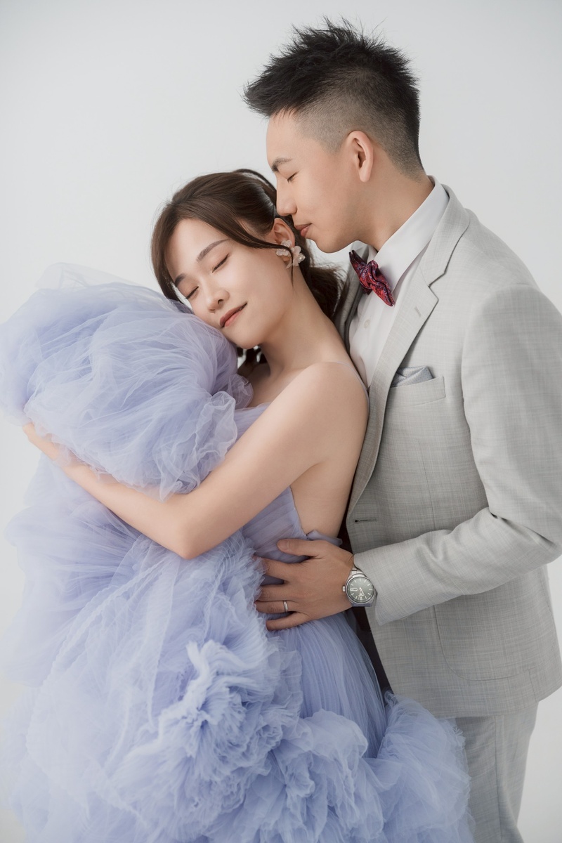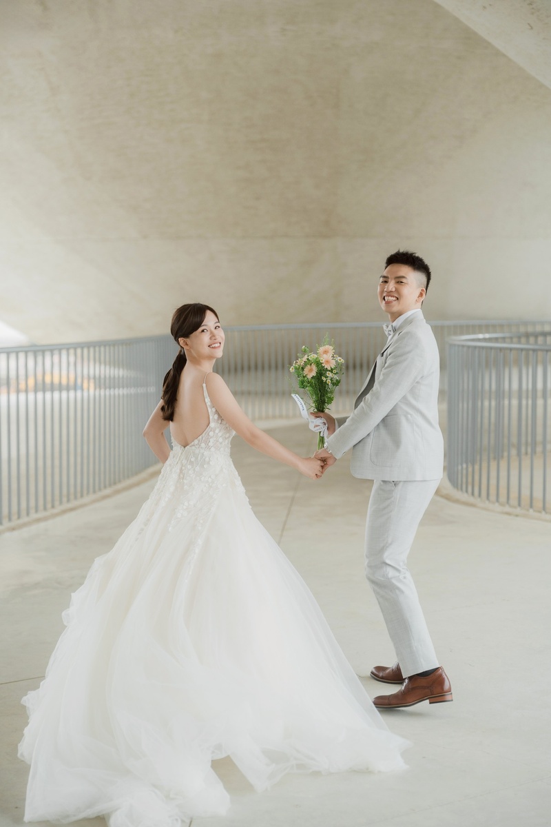 討論時跟大寶老師說我們比較I人,擔心面對鏡頭會尷尬,但實際在拍攝時大寶老師用輕鬆的語氣及一步一步的引導與互動,不會讓人覺得刻意,反而讓我們漸漸的比較不緊張,偶而搭配大寶老師的垃圾話,讓我們大笑出來,而那瞬間捕捉的照片卻意外的美。因為當天天氣非常糟糕,取消了原有的外景,在老師的推薦下到桃園的半戶外建築,在傘都撐不住開花的強勁風下,原本擔心拍不出喜歡的照片,但拿到毛片覺得好美!大寶老師在構圖與光影掌握上非常細膩跟用心,感謝老師的建議讓我們留下不同於棚內的婚紗照,以及謝謝維尼造型師的妝髮讓我很喜歡的紫色蛋糕裙、還有魚尾白紗有很美的樣子,還有強風都吹不散的完美瀏海。謝謝當天團隊的每個人那麼照顧我們,讓我們有一場很棒的婚紗體驗。
