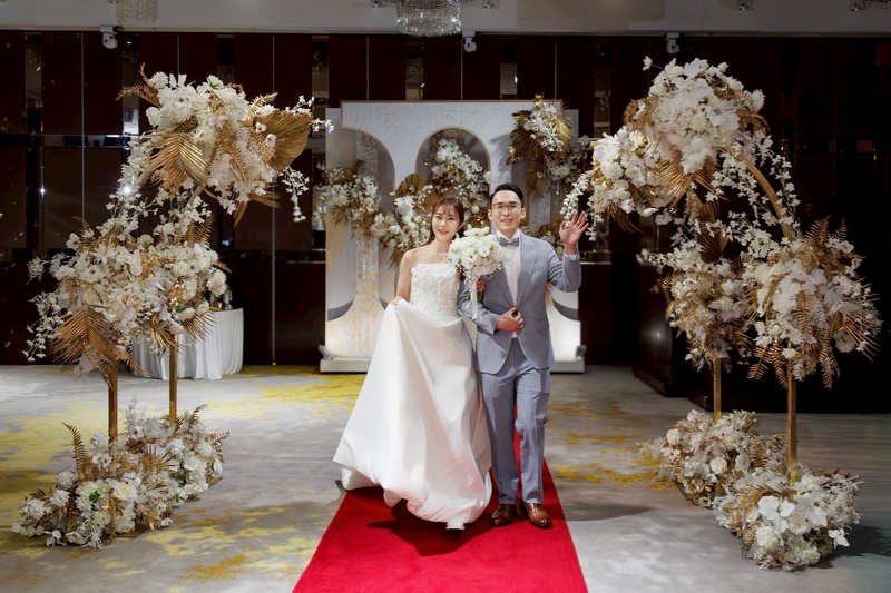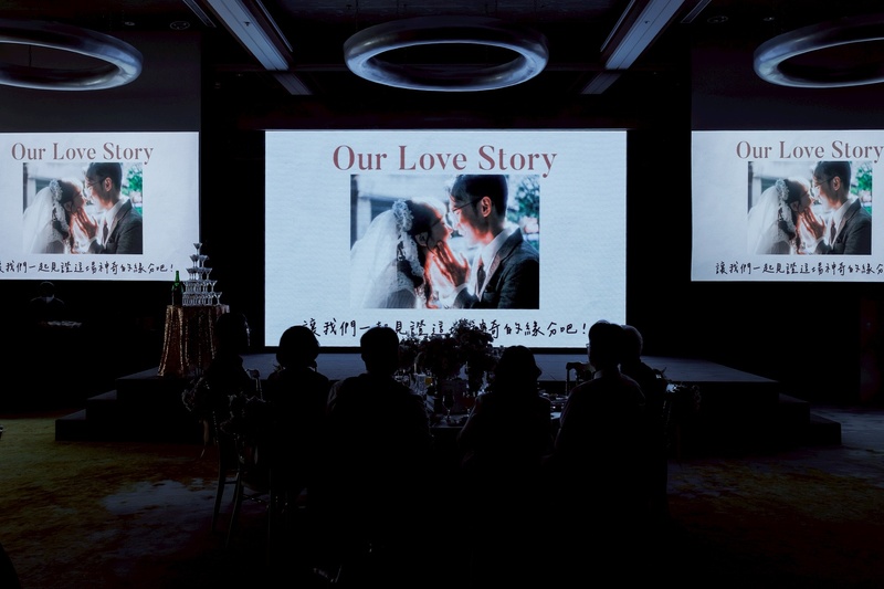 我們也很喜歡婚宴館華麗又有質感的白金色布置風格,整體氛圍非常典雅,投影布幕也非常大,即使坐在較角落的賓客,也完全不用擔心看不到影片。進場時搭配投影布幕與燈光的巧妙安排,讓後來攝影師交付的照片成品效果非常好,每次看照片都會覺得很感動🥹💖