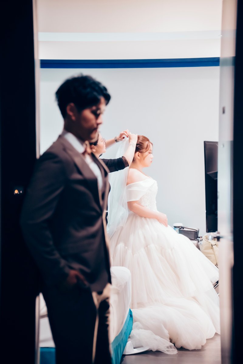 婚禮當天,是雙人雙攝進行。我們不小心拿到很小的房間,克里夫團隊還能在有限的空間找角度拍攝換裝,實在令人佩服。