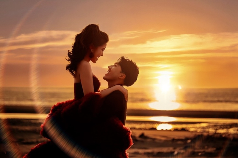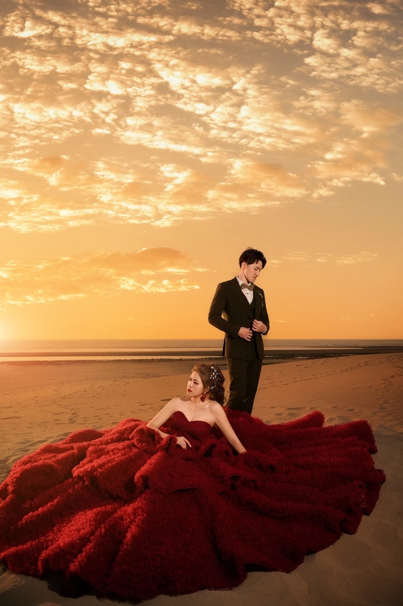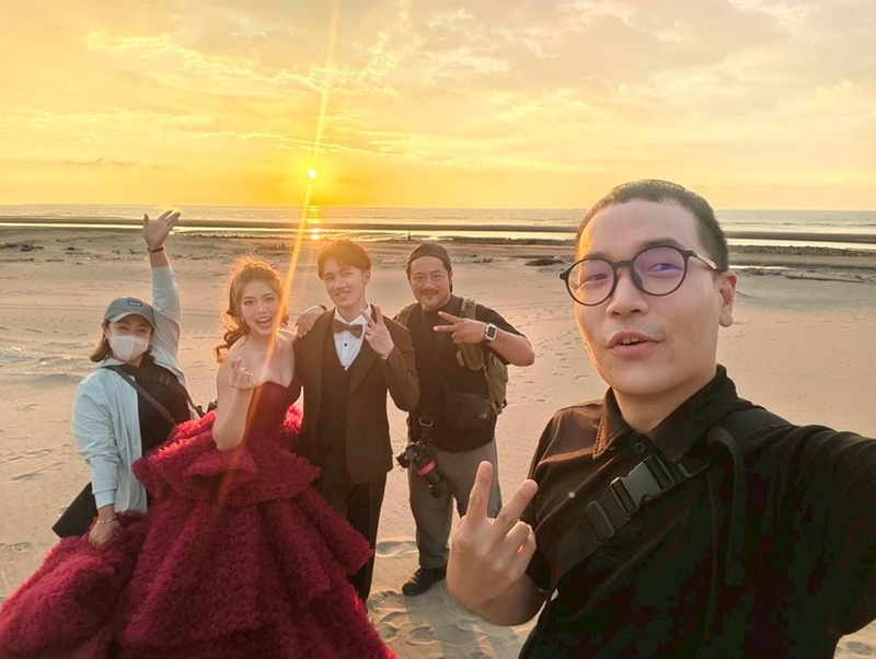 這次我們一共準備了4 套禮服、全戶外拍攝,拍攝當天由大邱、ANDA、阿顯三人組成的團隊默契真的非常好,引導俐落、流程順暢,讓我們省下不少時間,可以多跑幾個拍攝點,也能好好處理妝髮。比較可惜的是,最後一套沒能趕上夕陽。不過拍攝結束後,小馬第一時間就等我們回來,馬上敲定補拍時間。正好那天也是小馬生日,還順便幫我們的馬媽慶生了一下。