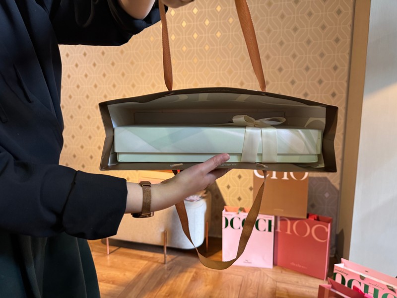 最後店員給我們看了很多配色,我們選了小島秘境+怦然秘境/粉色底綠色字袋子(店員說禮盒可以不同但袋子要一樣),小盒的送給朋友,紅色送給長輩。