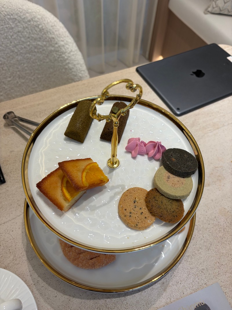 我最後選擇了「單層 12 入+手綁緞帶」的組合。特別喜歡它盒側上下蓋的撞色設計,細節處提升了整體的層次感。最棒的是內部品項可以自由組合,我刻意挑選了不同類型的蛋糕與餅乾混搭,希望能讓賓客品嚐到最豐富的口味。