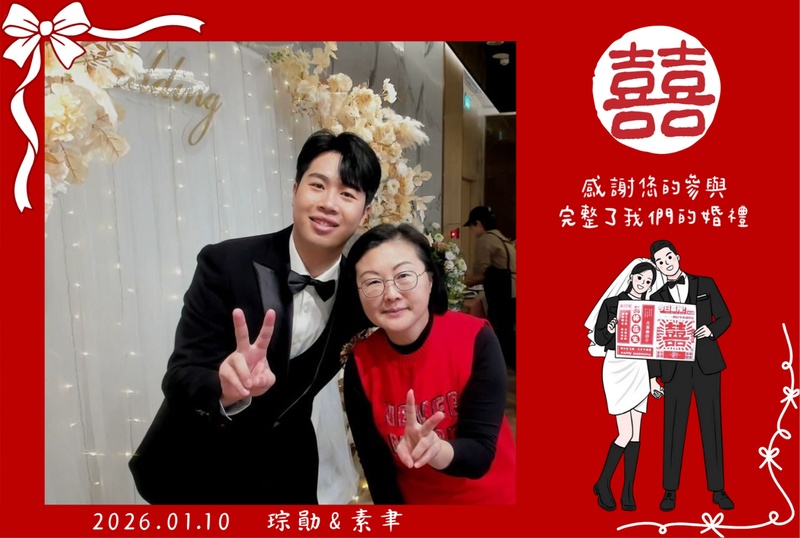 我們婚禮選擇拍拍印,是一個非常正確的決定。賓客多為親戚與長輩,活動前其實有點緊張成效,但拍拍印在婚禮前一個月就成立群組,耐心協助新人整理上架資料,也透過電話提醒當天流程與細節,讓整個準備過程相當順利。我有特別請他們多關照長輩,教學或直接協助拍照列印。沒想到當天效果超好,長輩們拍得非常開心,現場回饋都是稱讚工作人員細心、有耐心。照片受歡迎到印刷機不夠用,我們臨時加機,遇到餐廳需要撤場時,拍拍印也貼心表示會幫忙印完。婚禮後還收到大量賓客照片,轉交給大家時,每個人都又驚又喜,留下很棒的回憶。
