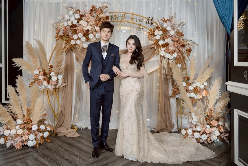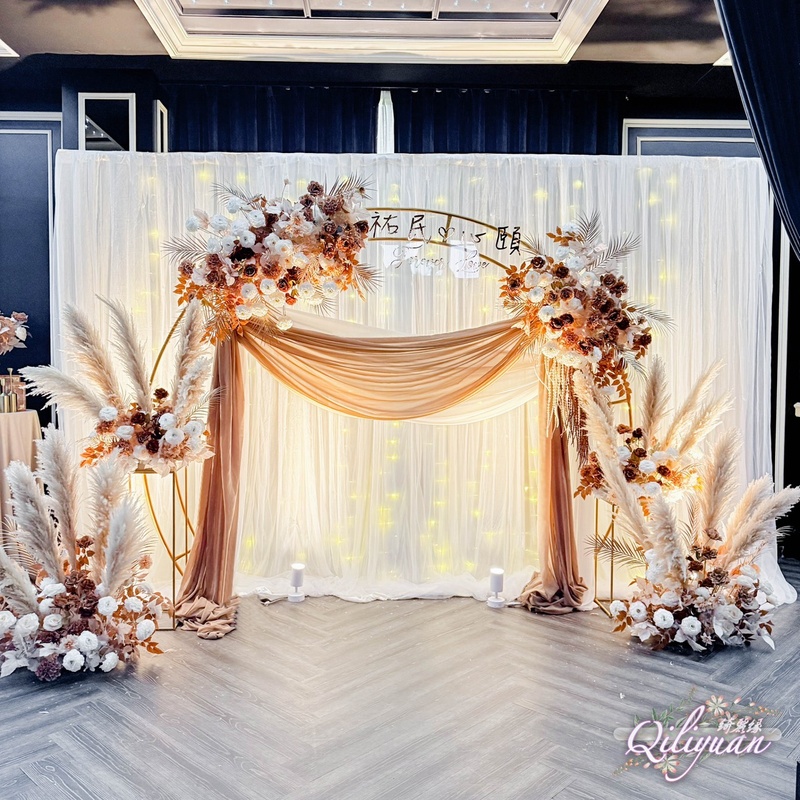 ✨亮點一:宛如藝術畫作的「送客背板」送客區是賓客合影最久的地方,綺麗緣設計的背板不只是背景,更像是一座充滿層次感的立體花園。花材的鮮豔度與層次感在攝影燈光下顯得極其高級,讓每一位朋友留下的照片都像雜誌封面一樣精緻。
