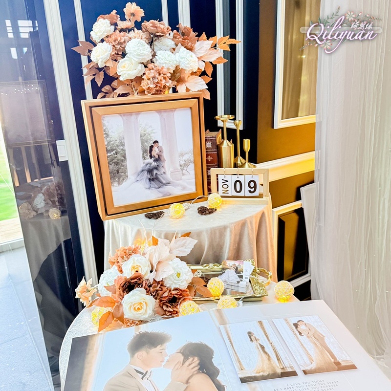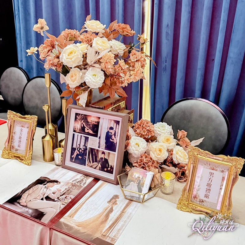 ✨ 亮點二:展現品味的「禮桌佈置」收禮桌是賓客的第一印象。綺麗緣用細膩的小花瓶與主題花卉錯落佈置,不僅色調與背板呼應,更在細微處展現了極高的美學功底,讓簡單的收禮區瞬間充滿了優雅的儀式感。