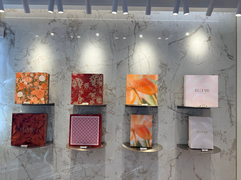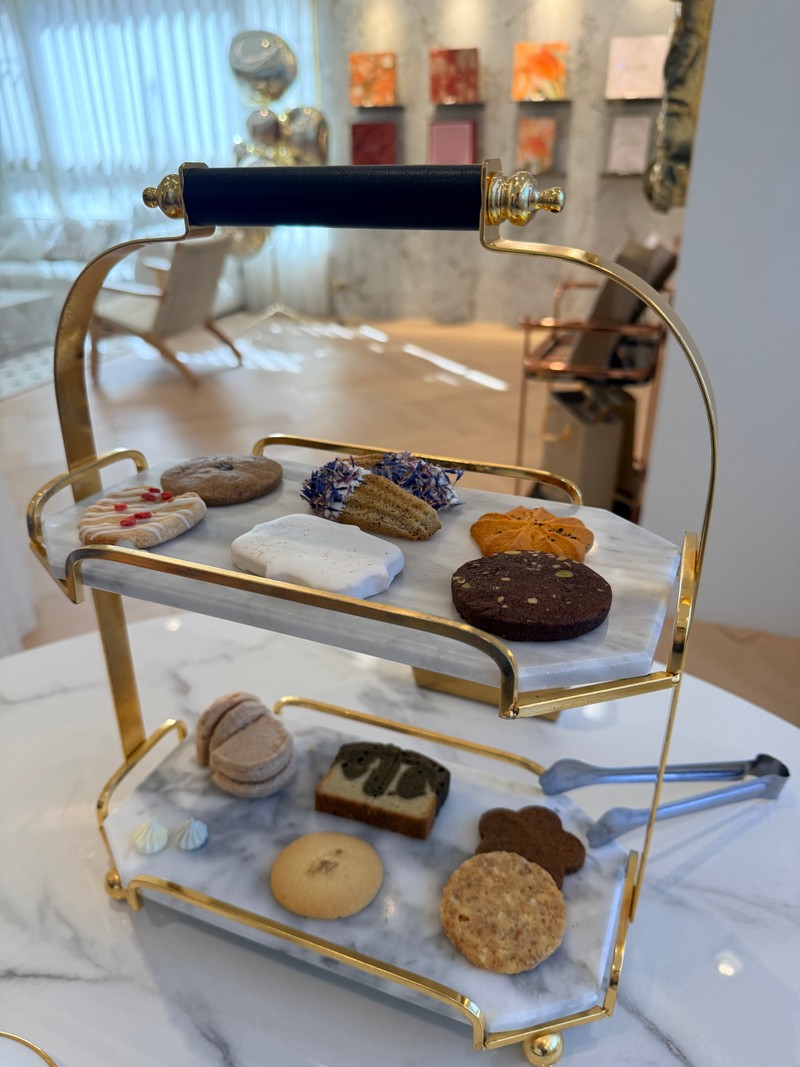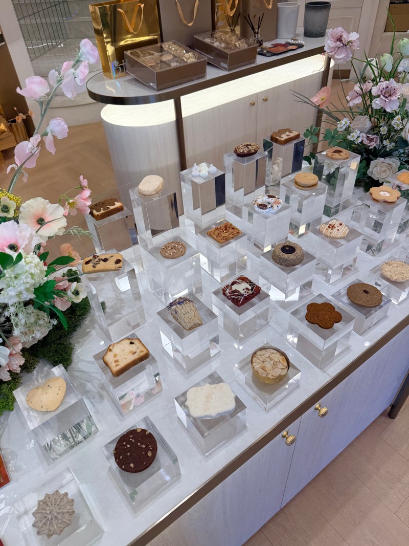 柔和的大理石與金色光影,搭配花藝與透明展示台,每一款餅乾都像小小的作品,被好好地呈現著。
