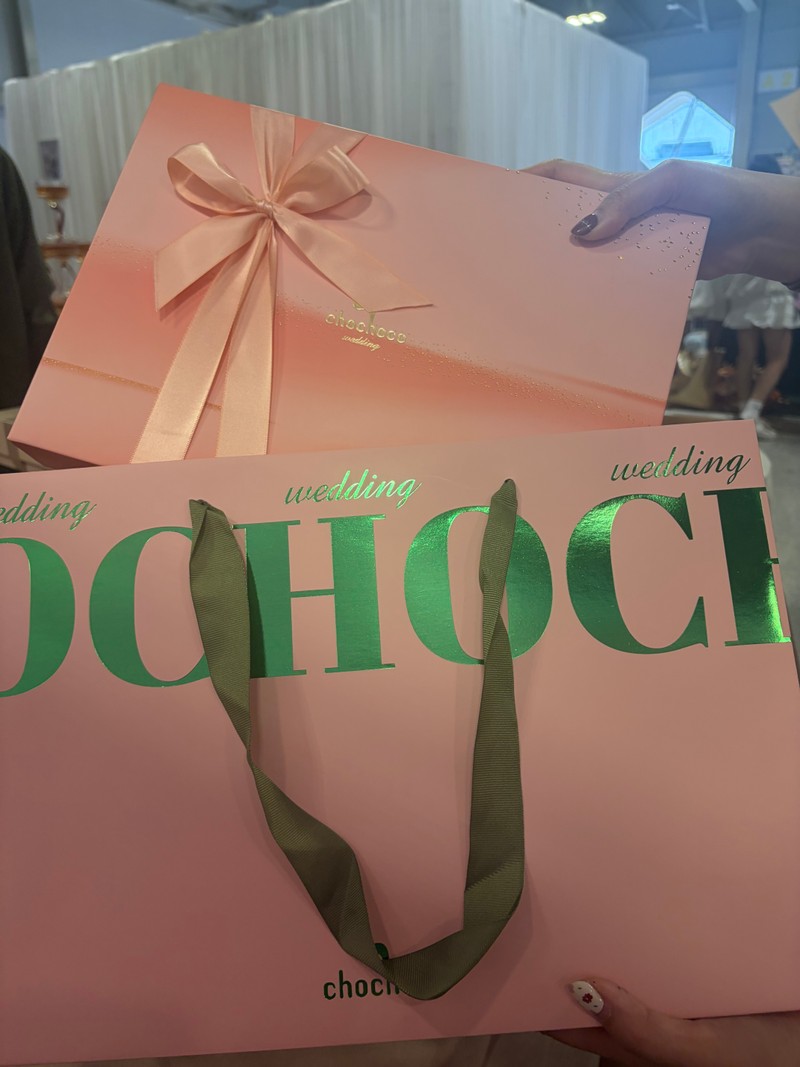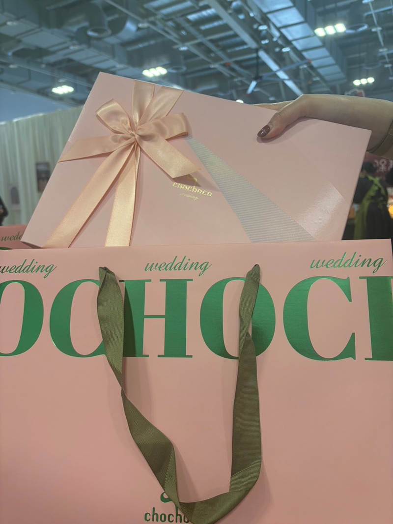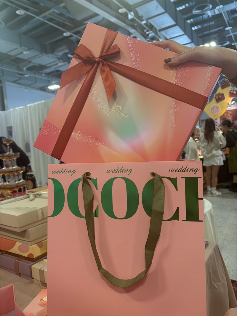 但粉色實體跟拍照顏色落差很多,所以我堅持要看過實體包裝盒才下定,於是和先生一起到婚展尋寶~