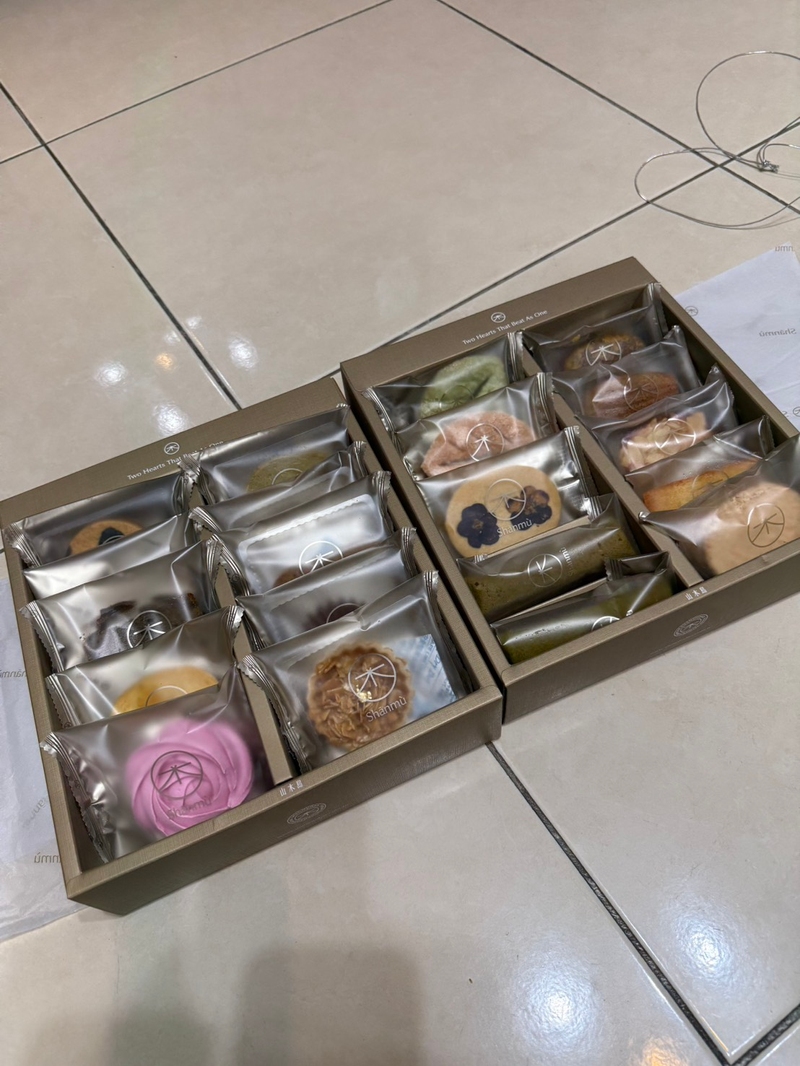 一打開盒蓋,每種品項都看起來非常好吃又好看,簡直美到捨不得吃,連家人也是讚不絕口。原本還擔心家人試吃會踩雷,結果咬下驚為天人,茶香乾淨、完全不膩口、甜度適中,真的會讓人忍不住一塊接一塊,完全慶幸自己當時在婚展沒看走眼!推薦費南雪和瑪德蓮,尤其是珍奶磅蛋糕有超乎預期的表現,森林酥是讓我們印象比較深刻的品項。