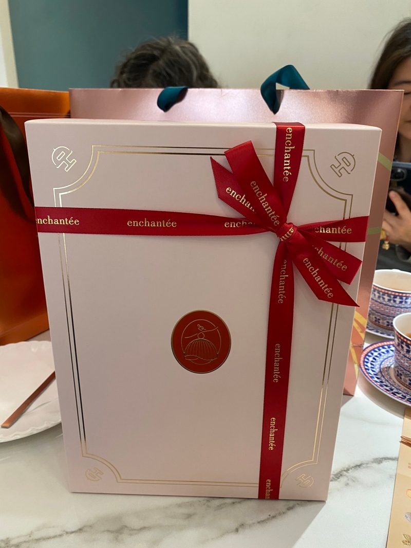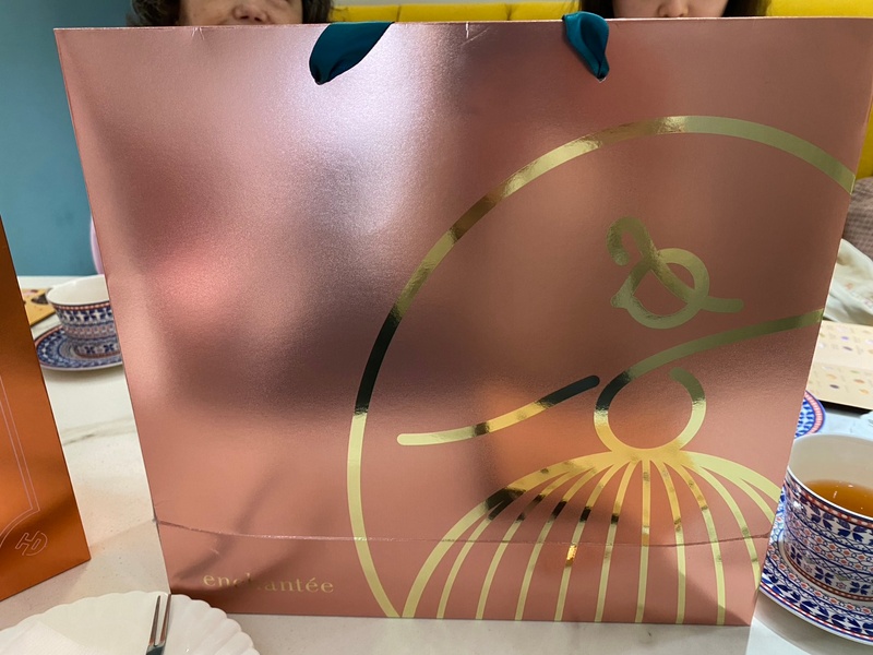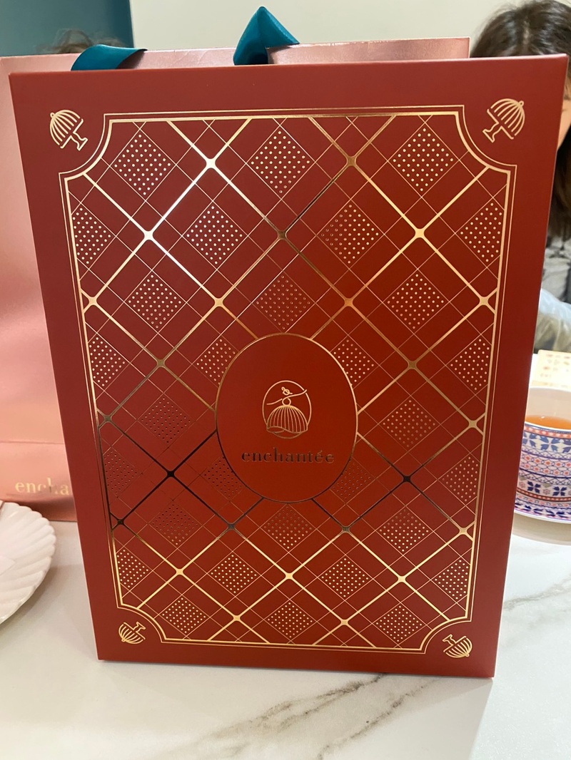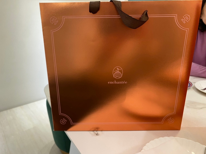 在準備期間,接洽人員帶我們到禮盒區,介紹禮盒款式並介紹各款式的差異,此時看到有個標示”壹加壹”訂製款才知道他們也是選擇”樂朗奇”。回到座位區會詢問想要看得盒型,店家會準備實體和提袋供參考,樂朗奇提帶有金色貴氣,粉色秀氣款搭配撞色提繩很吸睛和長輩喜歡的紅色喜氣高訂款。在選定後,店家也會準備新品的禮盒讓新人拆開體驗,同時搭配外袋的感覺來體驗一下,店家也說明喜餅的謝卡,有公版和客製版,取決於下訂的數量,以及重要的保存期限資訊。