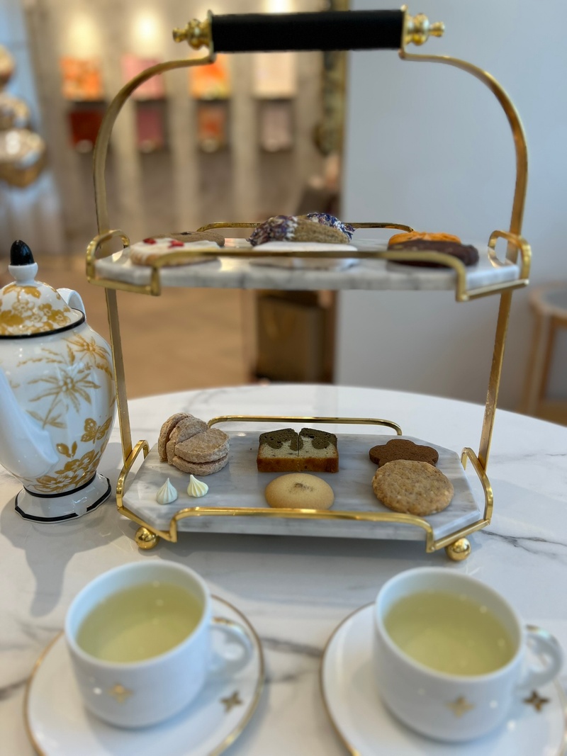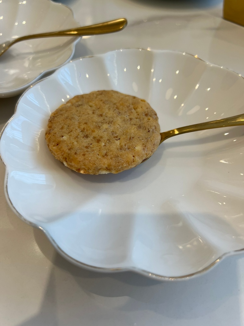 雖然那時候還沒打算辦婚禮,但老婆心心念念,我們回台中後馬上就衝去預約試吃。一踏進門市,那個華麗的裝潢真的沒話說,感覺我們瞬間變成了公主跟王子。更誇張的是試吃的擺盤,一端上來我還以為到了什麼高級下午茶餐廳!口味部分也很對我的胃,餅乾甜而不膩,配上一口茶簡直絕配,尤其是茶系列的餅乾,老婆跟我都超級喜歡。最讓我驚訝的是馬林糖,以前吃過的都死甜,但花神家做得非常順口,真的很有水準。