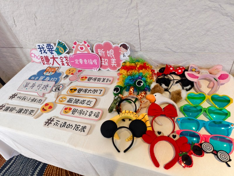 他們準備的道具也很用心,數十款各種風格的拍攝小物,不會只有制式幾樣,從搞笑到可愛、從浮誇到浪漫都有,很多人一拍完還會再回來換道具重拍,完全停不下來。