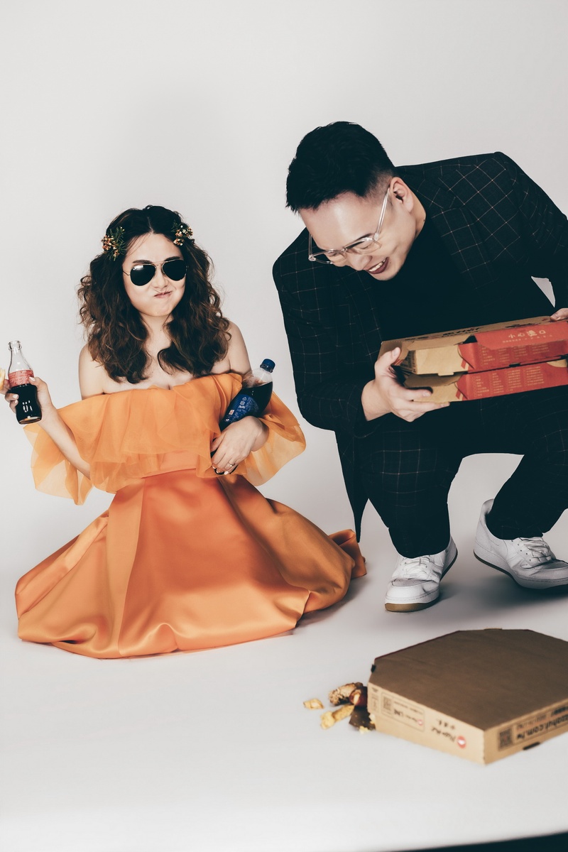 選完禮服後會和攝影師及造型師進行面談,針對企劃書內容及挑選的禮服討論拍攝當天的造型及照片風格;造型師Nicky經驗豐富,雖然我對造型幾乎沒什麼想法,但Nicky會告知拍攝前需要的注意事項,如頭髮、膚況,也會和新人討論對於造型上的建議,有任何的需求或想法都可以跟Nicky說,他的魔小手都可以完成❤️在面談當天總算見到攝影師Eddie本人,有跟他明確表示我們就是要瘋癲一點的風格,不然我們很怕面對鏡頭會有尷尬的感覺,如果有想要指定的拍攝道具或是場景都可以跟Eddie討論。