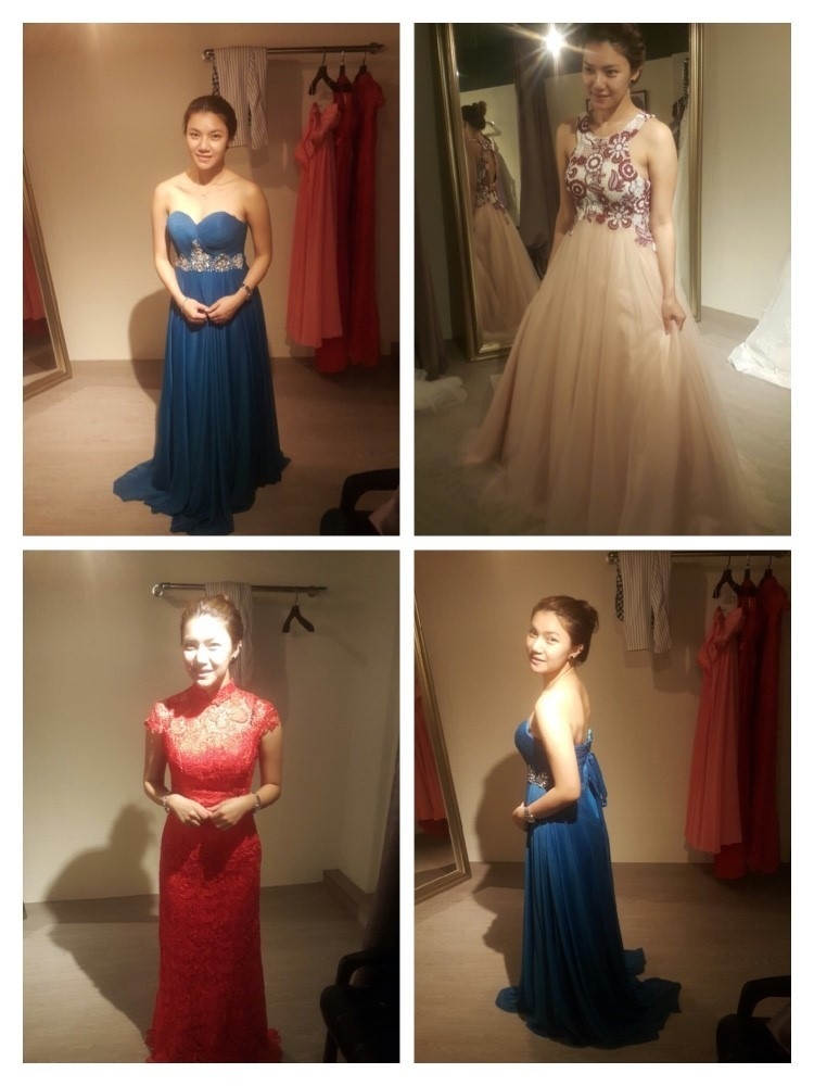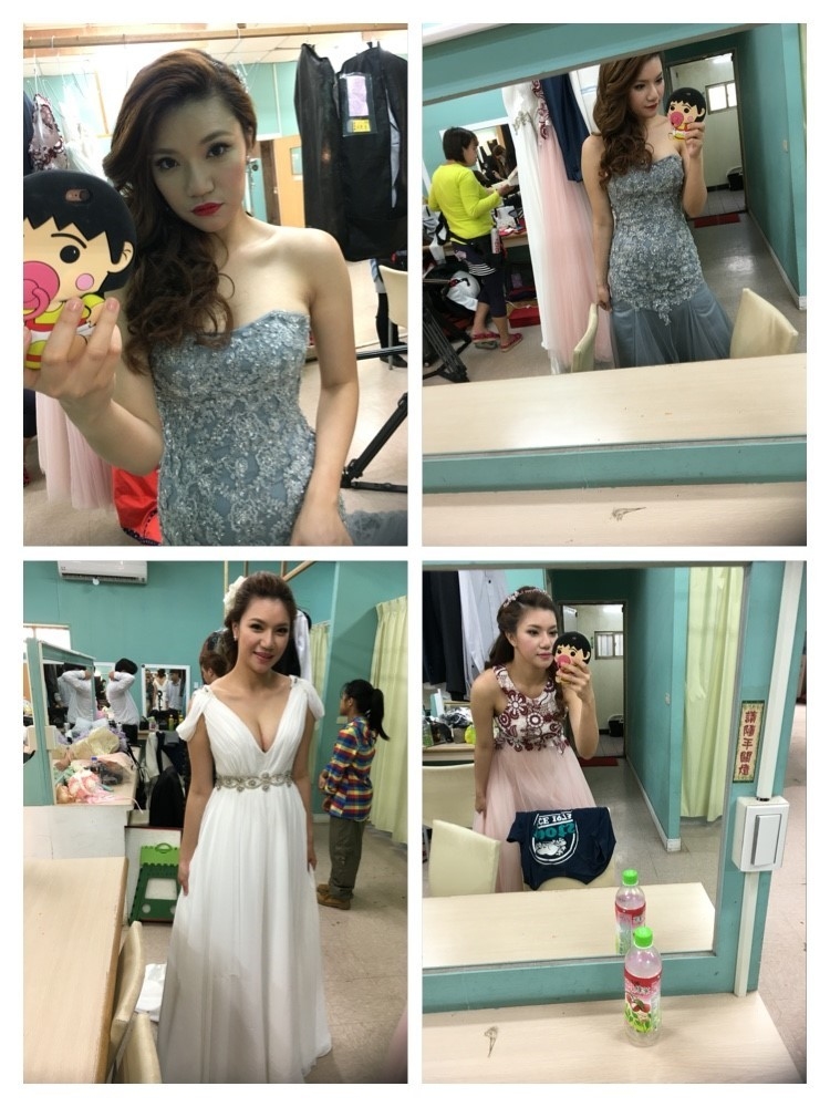 想不到這邊衣服每件款式都很風格,立馬挑了幾件試穿,燕燕整個很熟練的幫忙(有實戰工作經驗有差),會幫你分析眉眉角角,以下是新娘素顏一下班就來試穿(腦公的拍照技術已算很好了,沒有把我的頭給切半或者拍翻白眼,請見諒),一下子我第一眼就選了五到六套,便已決定選好四套拍攝婚紗的衣服,因為穿起來都很滿意,速度之快,且也給姐妹們過濾,她們也稱讚工作室的衣服,真的也另人開心,不用跑很多趟去試穿