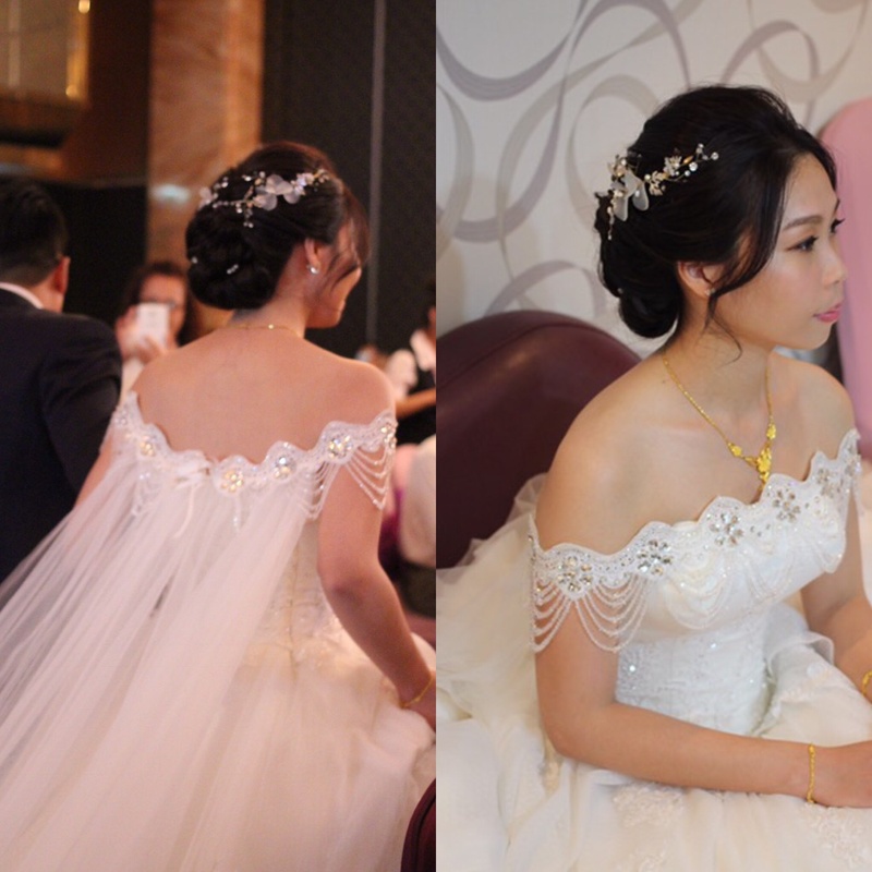 白紗禮服她幫我作了兩個造型,蕎蕎霸氣的說迎娶跟進場造型怎麼能一樣?進場她幫我搭配肩紗,真的好美喔!朋友也都說好看