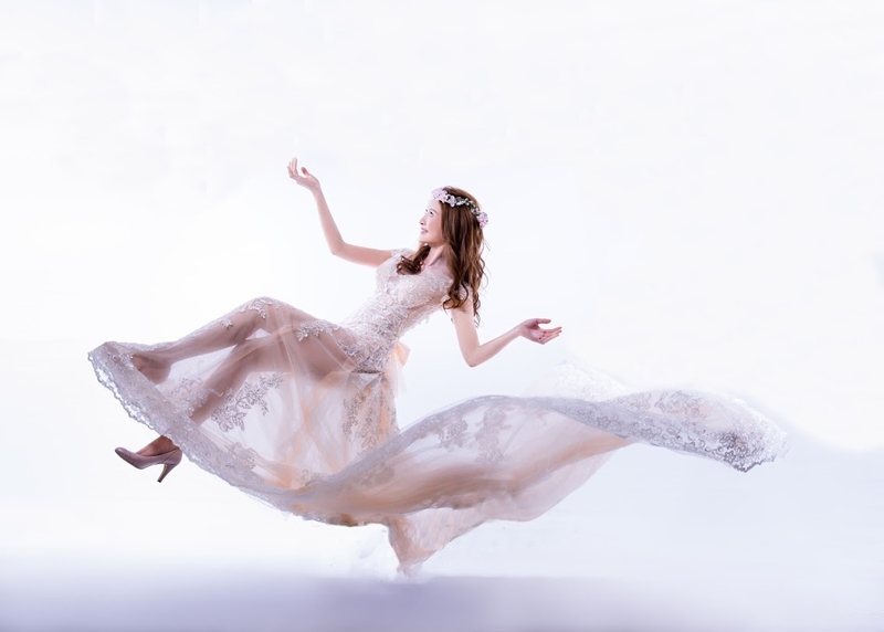 想拍形象照及個人寫真照很久了。聽說很多政商人士在晶綻囍事拍形象照。我在今年三月時預約了拍照,在拍照前一週去試穿禮服。這裡的禮服真的很厲害,我想選一件裸紗的禮服,光透膚蕾絲款,禮服小姐就拿好多件給我試穿。我選了一件粉色透明蕾絲禮服,上面很合身,群擺很美,照光可透雙腿。
