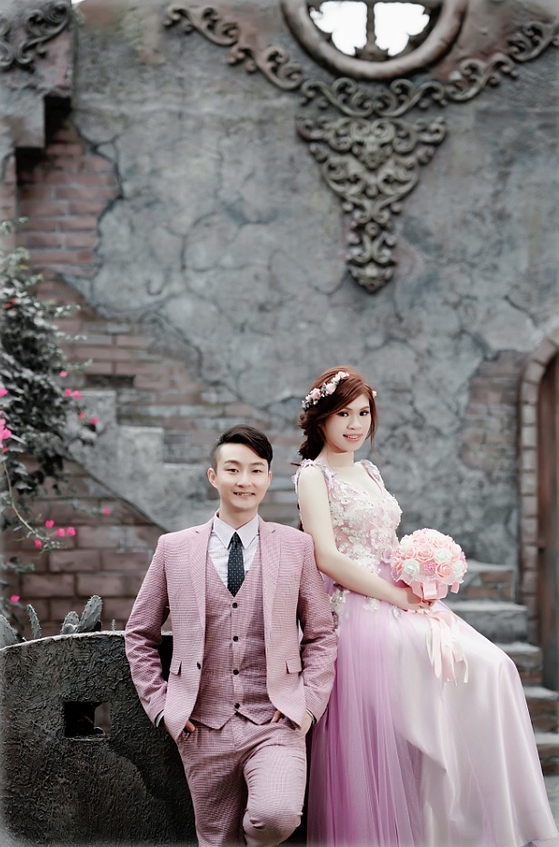 到拍攝基地我們將物品放到化妝間,格林童話內有設置很多小房間,Penny幫我看一下裝容有沒有脫妝,還好今日天氣很好陰天中帶點陽光,接著拍攝第一套是白紗,燈光師阿牛會先在拍攝前教我們配合的注意事項-要抬頭挺胸、手和脖子盡可能遠離這樣才能拍出很美的曲線、在看向攝影師的鏡頭時下巴要收然後露出七分微笑等。剛開始拍攝的時候表情比較僵硬,攝影師Hido會很有耐心的指引我們擺的姿勢,Hido說話非常有趣,每一個擺的姿勢都會用很詼諧的話語來敘述,一方面可以減緩緊張的情緒還可以展現出最自然的畫面,Hido是一位非常細膩的攝影師,每個景點該使用的道具和呈現的畫面,他會在腦海中快速構圖然後我們一個動作一個指令,就連續拍出很多不同風格的照片。