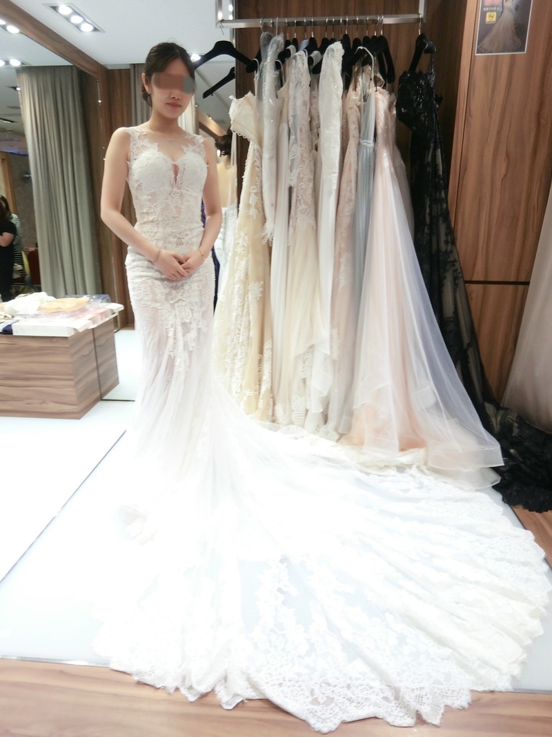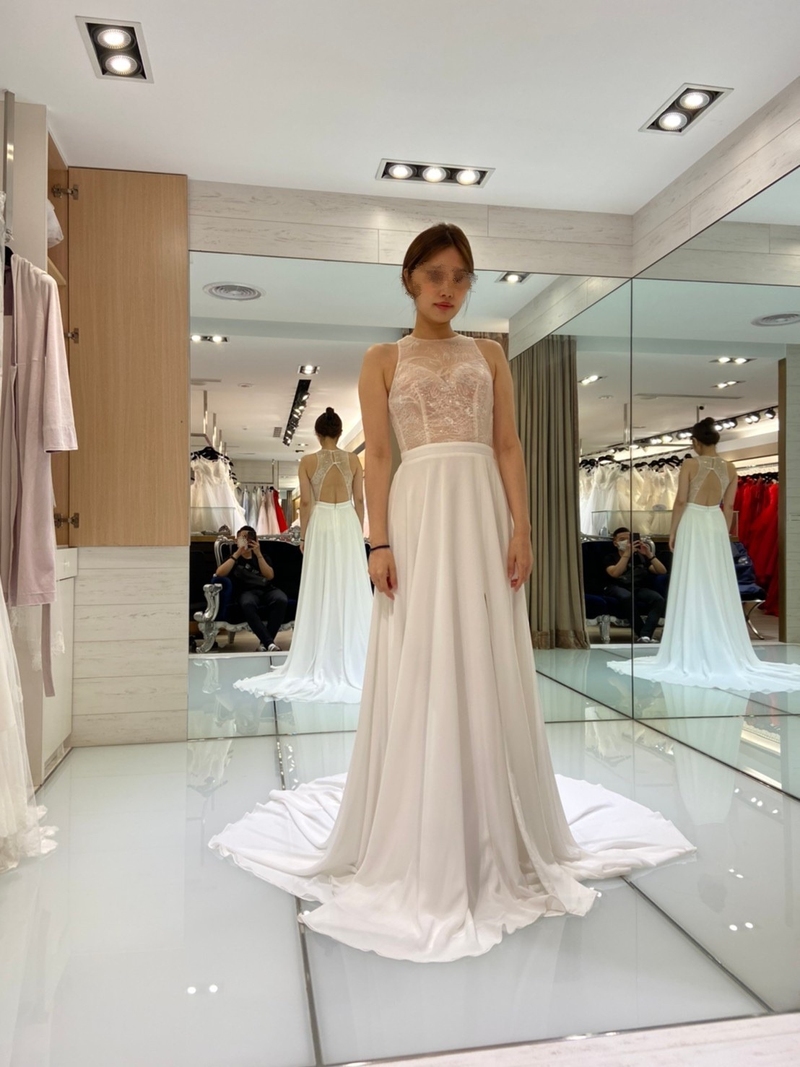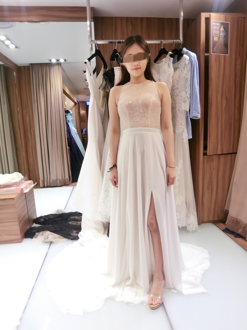 試禮服時,我的禮服顧問是Doris,人很親切又有耐心,針對我想呈現的婚紗風格仔細的給予我許多專業的意見,幫我挑出適合我的禮服試穿。還會找出禮服的穿搭照片讓我觀賞拍出來的感覺,使我在挑選衣服時能更有方向。而我試穿時也會提供她個人的意見,如果穿起來的效果不佳,也會直接的告訴我一起溝通。