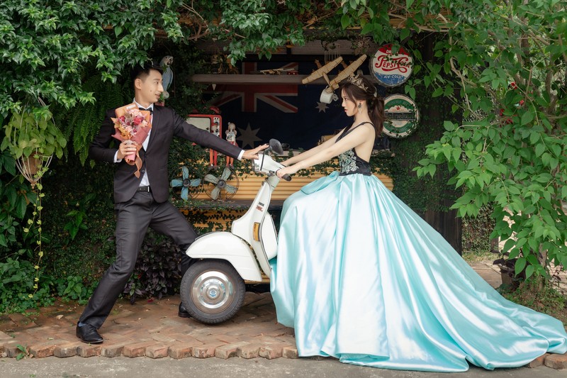 4.接待、服裝挑選:接待我們的是淑華姊姊,她非常有耐心,有問必答,可以減少新人的壓力,不用害怕不清楚各種禮俗專有名詞而不敢提問,淑華姊姊會建立群組,方便新人、接待、服裝師、攝影師、造型師間隨時提問、溝通,所以我們的問題都可以輕鬆獲得解答,謝謝淑華姊姊!另外服裝挑選由淑蓮妹妹負責,她包辦服裝推薦、改衣服,認真又專業!謝謝她推薦超好看蒂芬妮綠浪漫又性感的婚紗,拍照效果超好!